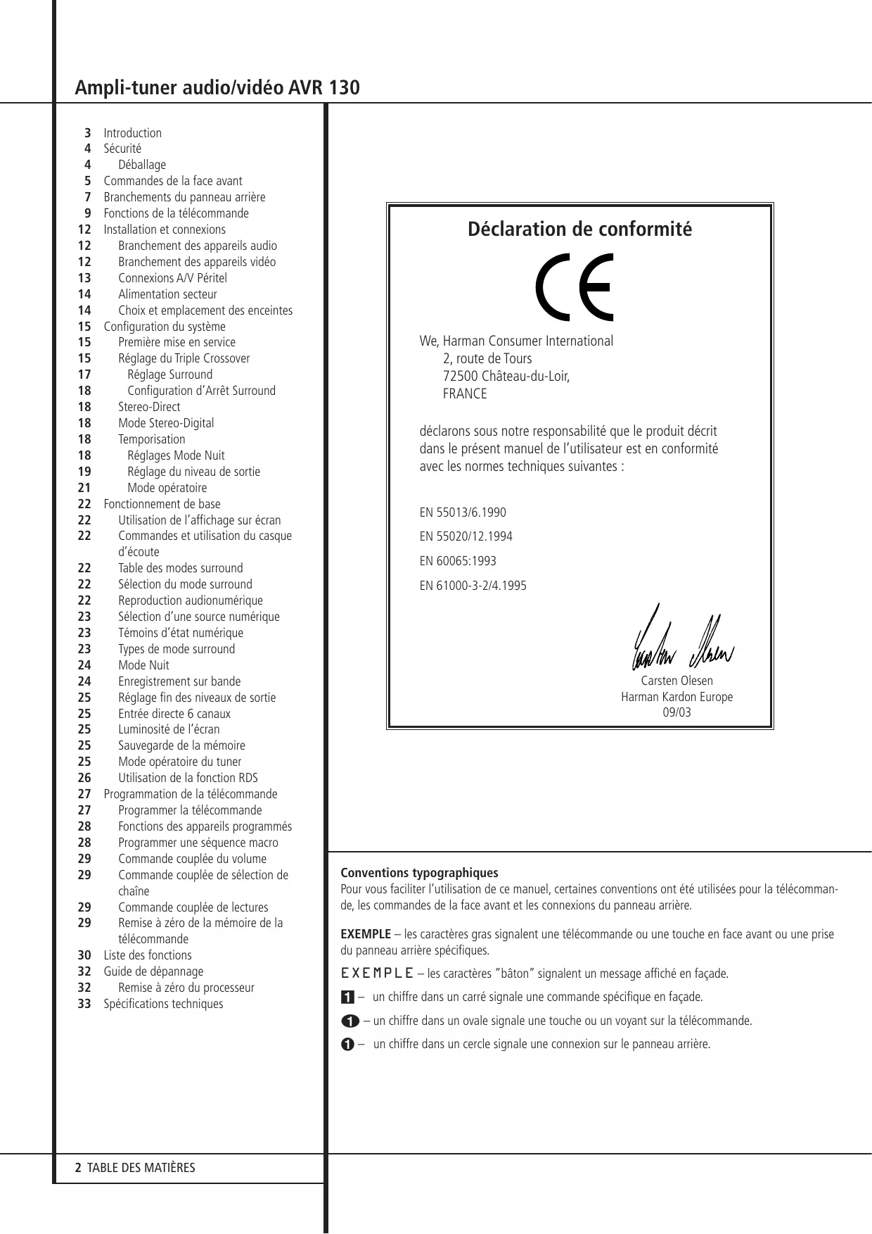 Introduction Sécurité Déballage Commandes de la face avant Branchements du panneau arrière Fonctions de la télécommande Installation et connexions Branchement des appareils audio Branchement des appareils vidéo Connexions A/V Péritel Alimentation secteur Choix et emplacement des enceintes Configuration du système Première mise en service Réglage du Triple Crossover Réglage Surround Configuration d’Arrêt Surround Stereo-Direct Mode Stereo-Digital Temporisation Réglages Mode Nuit Réglage du niveau de sortie Mode opératoire Fonctionnement de base Utilisation de l’affichage sur écran Commandes et utilisation du casque d’écoute Table des modes surround Sélection du mode surround Reproduction audionumérique Sélection d’une source numérique Témoins d’état numérique Types de mode surround Mode Nuit Enregistrement sur bande Réglage fin des niveaux de sortie Entrée directe 6 canaux Luminosité de l’écran Sauvegarde de la mémoire Mode opératoire du tuner Utilisation de la fonction RDS Programmation de la télécommande Programmer la télécommande Fonctions des appareils programmés Programmer une séquence macro Commande couplée du volume Commande couplée de sélection de chaîne Commande couplée de lectures Remise à zéro de la mémoire de la télécommande Liste des fonctions Guide de dépannage Remise à zéro du processeur Spécifications techniques Déclaration de conformité We, Harman Consumer International 2, route de Tours 72500 Château-du-Loir, FRANCE déclarons sous notre responsabilité que le produit décrit dans le présent manuel de l’utilisateur est en conformité avec les normes techniques suivantes : EN 55013/6.1990 EN 55020/12.1994 EN 60065:1993 EN 61000-3-2/4.1995 Carsten Olesen Harman Kardon Europe 09/03 Conventions typographiques Pour vous faciliter l’utilisation de ce manuel, certaines conventions ont été utilisées pour la télécommande, les commandes de la face avant et les connexions du panneau arrière. EXEMPLE – les caractères gras signalent une télécommande ou une touche en face avant ou une prise du panneau arrière spécifiques. EXEMPLE – les caractères ”bâton” signalent un message affiché en façade. 1 – un chiffre dans un carré signale une commande spécifique en façade. 0 – un chiffre dans un ovale signale une touche ou un voyant sur la télécommande. – un chiffre dans un cercle signale une connexion sur le panneau arrière.