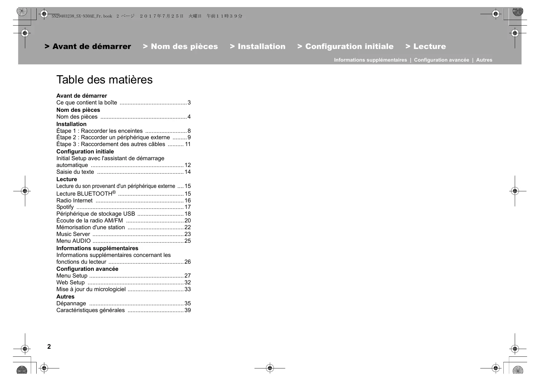 Avant de démarrer Ce que contient la boîte 3 Nom des pièces Nom des pièces 4 Installation Étape 1 : Raccorder les enceintes 8 Étape 2 : Raccorder un périphérique externe 9 Étape 3 : Raccordement des autres câbles 11 Configuration initiale Initial Setup avec l'assistant de démarrage automatique 12 Saisie du texte 14 Lecture Lecture du son provenant d'un périphérique externe .... 15 Lecture BLUETOOTH® 15 Radio Internet 16 Spotify 17 Périphérique de stockage USB 18 Écoute de la radio AM/FM 20 Mémorisation d'une station 22 Music Server 23 Menu AUDIO 25 Informations supplémentaires Informations supplémentaires concernant les fonctions du lecteur 26 Configuration avancée Menu Setup 27 Web Setup 32 Mise à jour du micrologiciel 33 Autres Dépannage 35 Caractéristiques générales 39