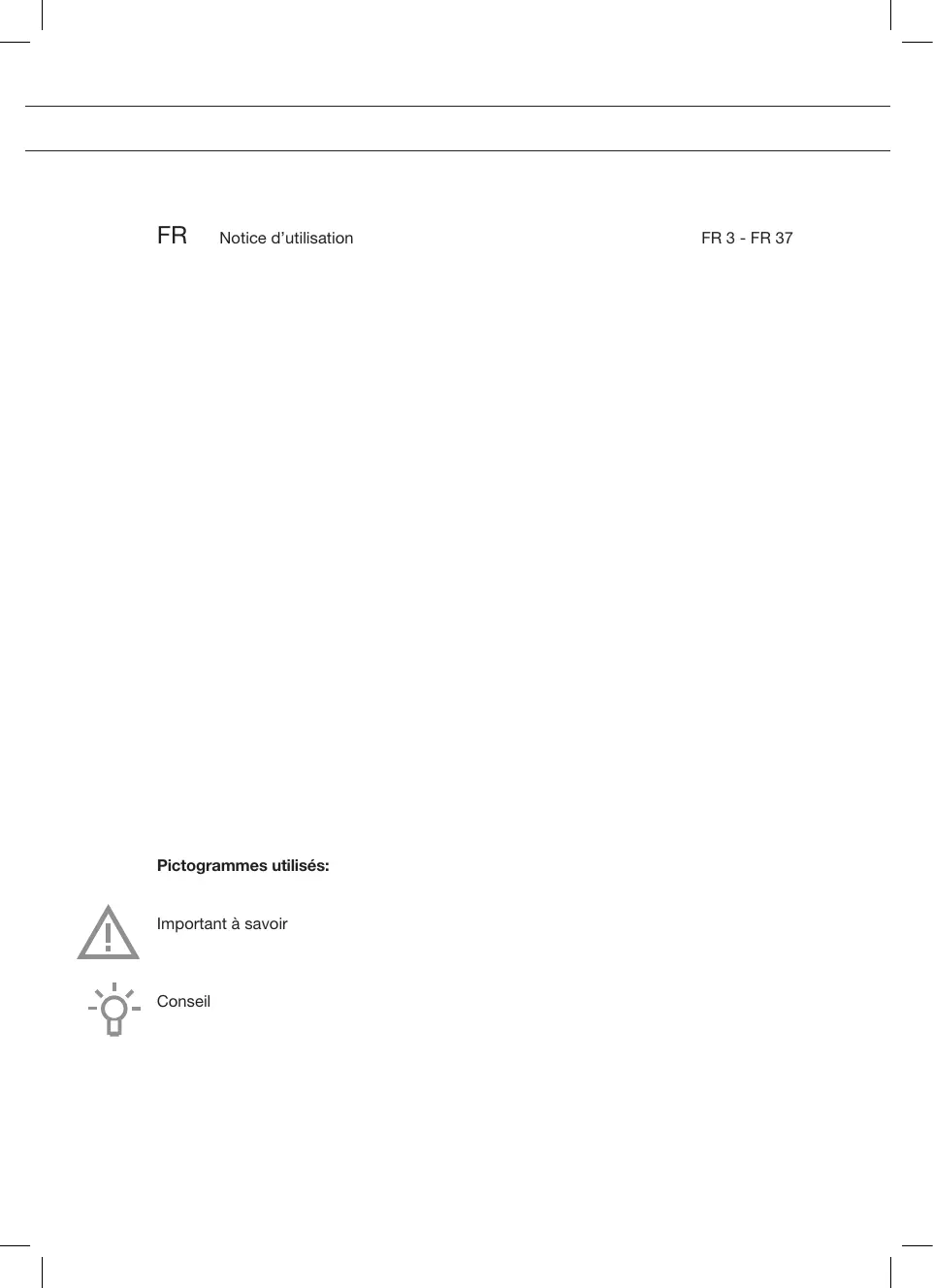 Notice d’utilisation Pictogrammes utilisés: Important à savoir Conseil FR 3 - FR 37 SOMMAIRE Votre table de cuisson Présentation Bandeau de commandes Description Consignes de sécurité Sécurité anti-surchauffe Limiteur de durée de cuisson Utilisation de l’induction Utilisation des commandes tactiles La cuisson par induction Fonctionnement de la cuisson par induction Les bruits de l'induction Casseroles Fonctionnement de l’induction Entretien induction Défauts induction Pannes