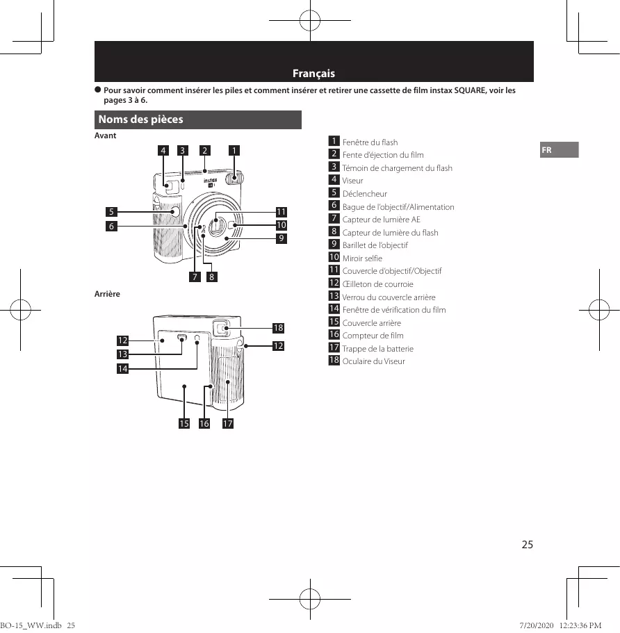 1 Fenêtre du flash 2 Fente d'éjection du film 3 Témoin de chargement du flash 4 Viseur 5 Déclencheur 6 Bague de l'objectif/Alimentation 7 Capteur de lumière AE 8 Capteur de lumière du flash 9 Barillet de l'objectif 10 Miroir selfie 11 Couvercle d'objectif/Objectif 12 Écouteur de courroie 13 Verrou du couvercle arrière 14 Fenêtre de vérification du film 15 Couvercle arrière 16 Compteur de film 17 Trappe de la batterie 18 Oculaire du viseur