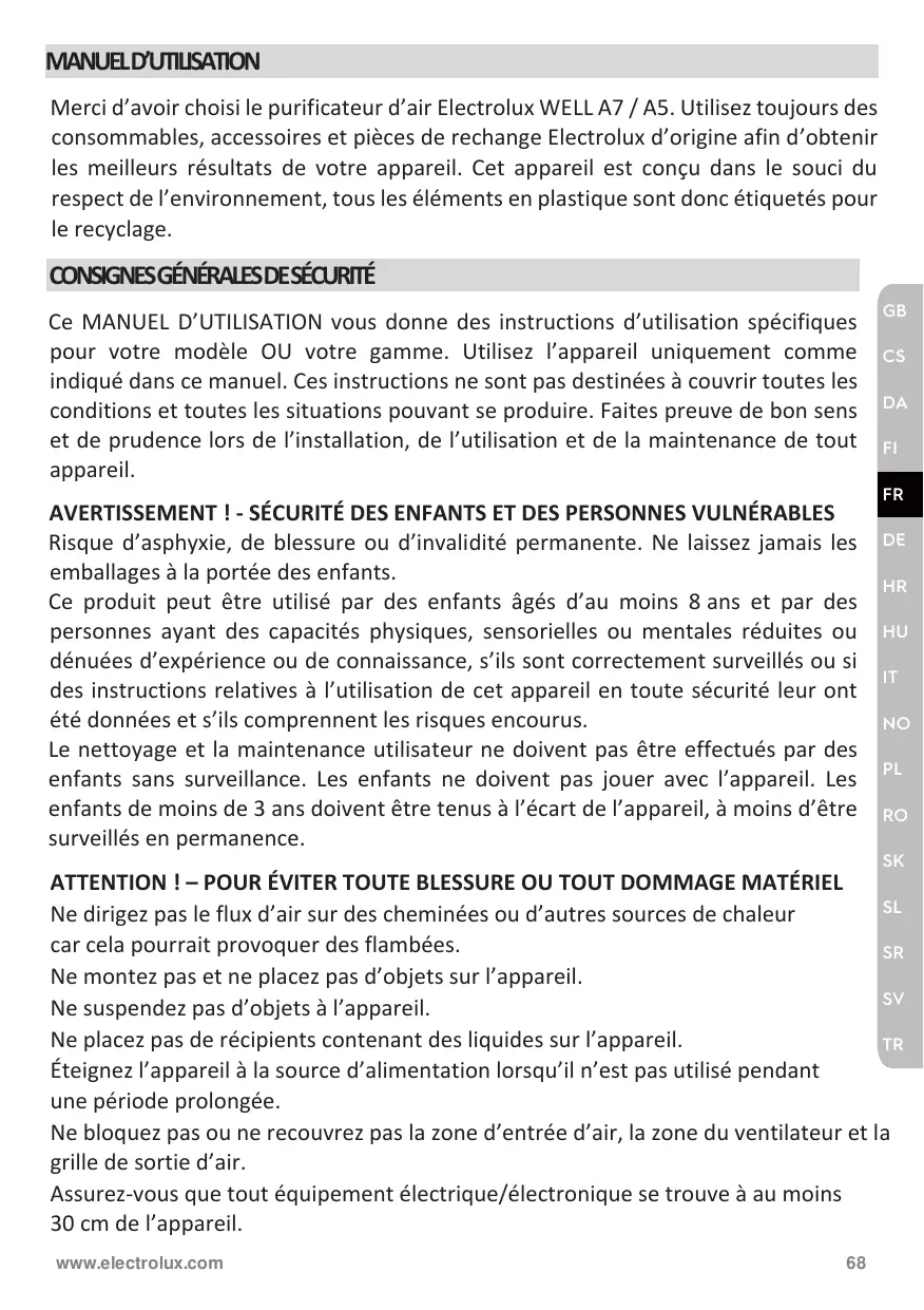 SR Ne montez pas et ne placez pas d’objets sur l’appareil. SV Ne suspendez pas d’objets à l’appareil. Ne placez pas de récipients contenant des liquides sur l’appareil. TR Éteignez l’appareil à la source d’alimentation lorsqu’il n’est pas utilisé pendant une période prolongée. Ne bloquez pas ou ne recouvrez pas la zone d’entrée d’air, la zone du ventilateur et la grille de sortie d’air. Assurez-vous que tout équipement électrique/électronique se trouve à au moins 30 cm de l’appareil. www.electrolux.com