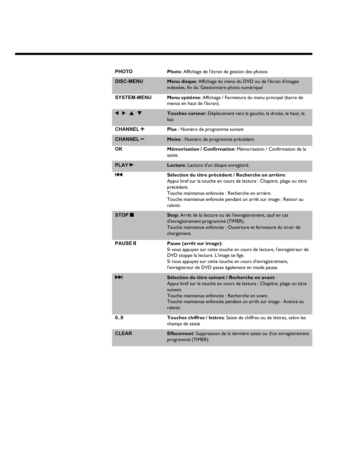 Sélection du titre précédent / Recherche en arri2re: Appui bref sur la touche en cours de lecture : Chapitre, plage ou titre précédent. Touche maintenue enfoncée : Recherche en arrière. Touche maintenue enfoncée pendant un arrêt sur image : Retour au ralenti. STOP h Stop: Arrêt de la lecture ou de l'enregistrement, sauf en cas d'enregistrement programmé (TIMER). Touche maintenue enfoncée : Ouverture et fermeture du tiroir de chargement. PAUSE 9 Pause (arr4t sur image): Si vous appuyez sur cette touche en cours de lecture, l'enregistreur de DVD stoppe la lecture. L'image se fige. Si vous appuyez sur cette touche en cours d'enregistrement, l'enregistreur de DVD passe également en mode pause.