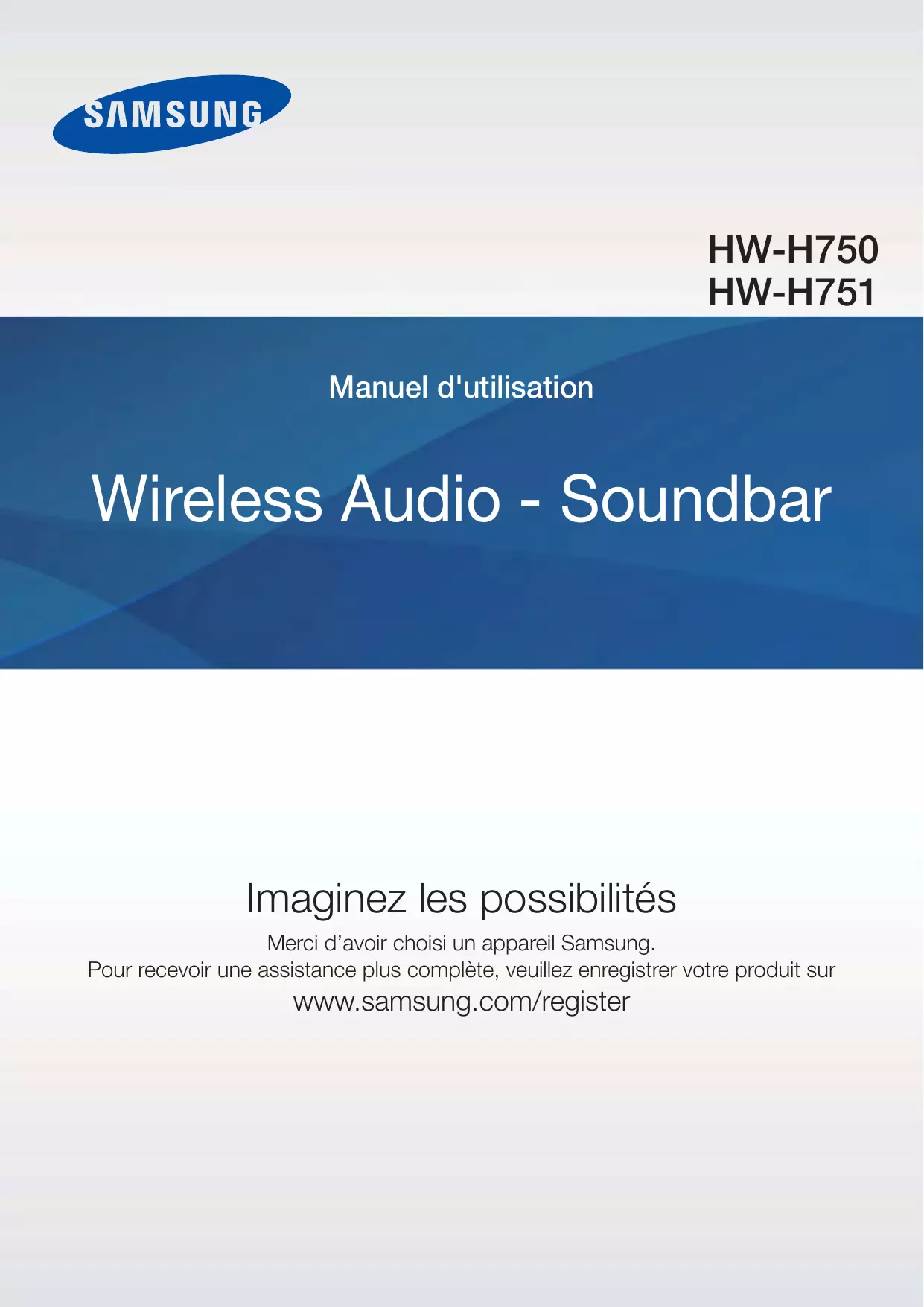 HW-H750 HW-H751 Manuel d'utilisation Wireless Audio - Soundbar Imaginez les possibilités Merci d’avoir choisi un appareil Samsung. Pour recevoir une assistance plus complète, veuillez enregistrer votre produit sur www.samsung.com/register CARACTÉRISTIQUES CARACTÉRISTIQUES TV SoundConnect TV SoundConnect vous permet d’écouter le son depuis votre téléviseur sur votre Soundbar via une connexion Bluetooth et vous permet de contrôler le son. HDMI L'interface HDMI permet la transmission simultanée des signaux audio et vidéo pour vous offrir une image plus nette. L'appareil est également équipé de la fonction ARC qui vous permet d'écouter le son de votre téléviseur sur le Soundbar via un câble HDMI. Cette fonction est uniquement disponible si vous connectez l'appareil à un téléviseur compatible ARC. Expansion du son ambiophonique La fonctionnalité Expansion du son ambiophonique ajoute de la profondeur et de la grandeur au son. L’Expansion du son ambiophonique est gérée par Sonic Emotion. Caisson de basses sans fil Le module sans fil de Samsung s'affranchit des câbles qui reliaient l'unité principale au caisson de basses. En remplacement du câblage, le caisson de basses se connecte à un module sans fil compact qui communique avec l'unité principale. Mode sonore spécial Vous avez le choix entre différents modes de son : CINEMA (CINÉMA) / SPORTS / VOICE (VOIX) / MUSIC (MUSIQUE) / STANDARD (Son Original), selon le type de contenu dont vous souhaitez profiter. Télécommande multifonction Vous pouvez utiliser la télécommande fournie pour contrôler diverses opérations en appuyant sur un simple bouton. Prise en charge de la fonction Hôte USB Vous pouvez connecter des périphériques de stockage USB externes (lecteur MP3, mémoire flash USB, etc.) afin d’en lire les fichiers musicaux à l’aide de la fonction USB HOST du système Soundbar. Fonction Bluetooth Vous pouvez connecter un périphérique Bluetooth à l'Ensemble Soundbar pour écouter de la musique avec un son stéréo de haute qualité, tout cela sans fil! NFC Connectez votre périphérique compatible NFC par l'intermédiaire de Bluetooth au Soundbar en utilisant cette procédure d'installation simple et écoutez la musique sur le périphérique via le Soundbar. Il est pris en charge dans les modèles de certains pays uniquement.