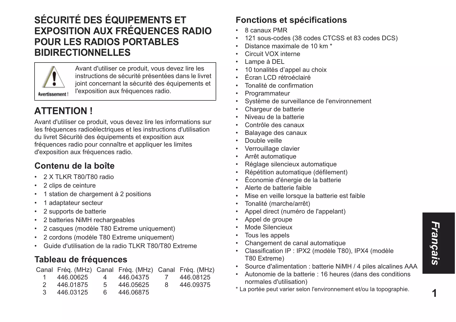 BIDIRECTIONNELLES Avant d'utiliser ce produit, vous devez lire les instructions de sécurité présentées dans le livret joint concernant la sécurité des équipements et l'exposition aux fréquences radio. ATTENTION ! Avant d'utiliser ce produit, vous devez lire les informations sur les fréquences radioélectriques et les instructions d'utilisation du livret Sécurité des équipements et exposition aux fréquences radio pour connaître et appliquer les limites d'exposition aux fréquences radio. Contenu de la boîte 2 X TLKR T80/T80 radio 2 clips de ceinture 1 station de chargement à 2 positions 1 adaptateur secteur 2 supports de batterie 2 batteries NiMH rechargeables 2 casques (modèle T80 Extreme uniquement) 2 cordons (modèle T80 Extreme uniquement) Guide d'utilisation de la radio TLKR T80/T80 Extreme Tableau de fréquences Canal