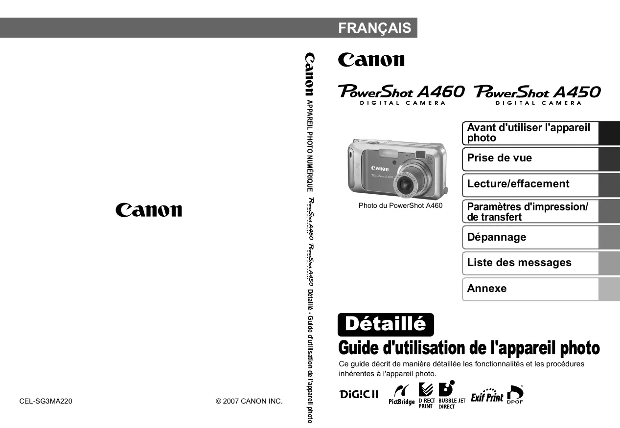 Avant d'utiliser l'appareil photo Prise de vue Lecture/effacement Photo du PowerShot A460 Paramètres d'impression/ de transfert Dépannage Liste des messages © 2007 CANON INC. Détaillé - Guide d'utilisation de l'appareil photo CEL-SG3MA220 Annexe Détaillé Guide d'utilisation de l'appareil photo Ce guide décrit de manière détaillée les fonctionnalités et les procédures inhérentes à l'appareil photo.