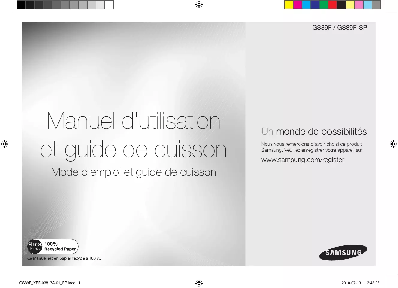 • GS89F / GS89F-Sp Manuel d'utilisation et guide de cuisson Un monde de possibilités Nous vous remercions d'avoir choisi ce produit Samsung. Veuillez enregistrer votre appareil sur www.samsung.com/register Mode d'emploi et guide de cuisson GS89F_XEF-03817A-01_FR.indd 1 2010-07-13 3:48:26 FRANÇAIS Table des matières Présentation rapide Présentation rapide p. 2