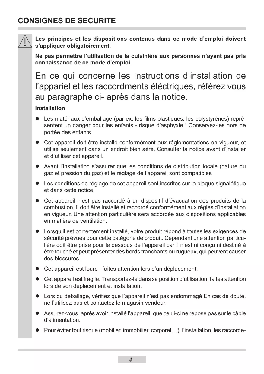 Ne pas permettre l'utilisation de la cuisinière aux personnes n'ayant pas pris connaissance de ce mode d'emploi.
