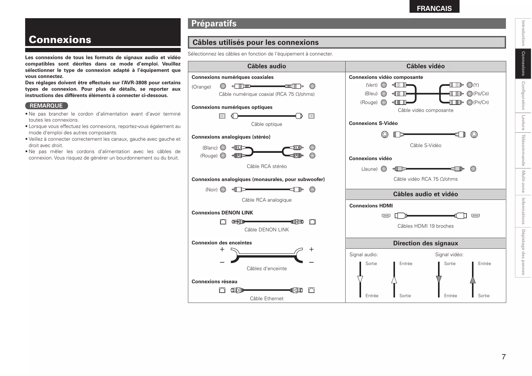 Les connexions de tous les formats de signaux audio et vidéo compatibles sont décrites dans ce mode d’emploi. Veuillez sélectionner le type de connexion adapté à l’équipement que vous connectez. Des réglages doivent être effectués sur l’AVR-3808 pour certains types de connexion. Pour plus de détails, se reporter aux instructions des différents éléments à connecter ci-dessous.