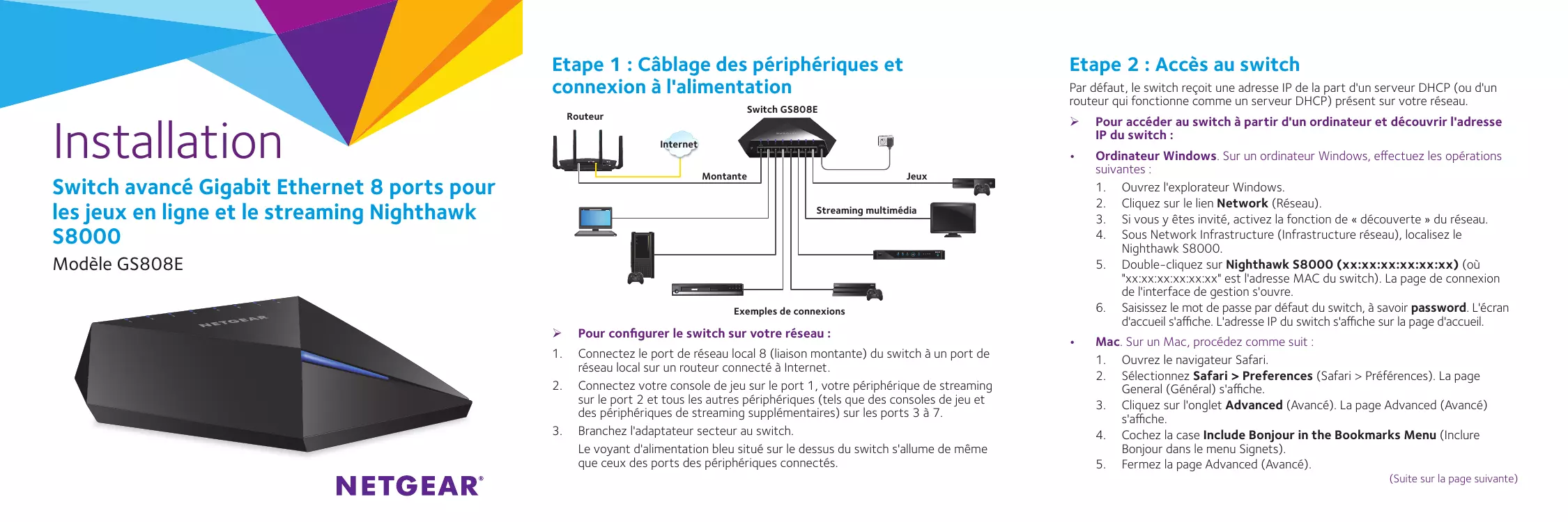 Etape 1 : Câblage des périphériques et connexion à l'alimentation Par défaut, le switch reçoit une adresse IP de la part d'un serveur DHCP (ou d'un routeur qui fonctionne comme un serveur DHCP) présent sur votre réseau. Switch GS808E Routeur Installation Etape 2 : Accès au switch ¾¾ Pour accéder au switch à partir d'un ordinateur et découvrir l'adresse IP du switch : Internet Montante Switch avancé Gigabit Ethernet 8 ports pour les jeux en ligne et le streaming Nighthawk S8000