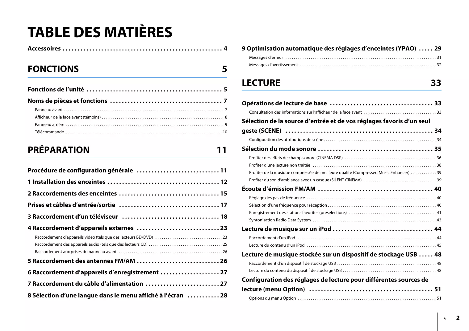 Raccordement du caisson de graves 16 Raccordements des enceintes 15 Réglage de l'impédance d'enceinte 14 Réglage de lecture aléatoire, musique d'iPod 47 Réglage de lecture répétée, musique d'iPod 47 Réglage des pas de fréquence 40 Réglage entrée, menu Option 52 Réglage subwoofer, menu Option 53 Réglage, menu Réglage 62 Réglages d'enceintes, optimisation automatique 29 2. Installez les enceintes dans un endroit frais, sec, loin des fenêtres et des sources de chaleur et de vibration, des poussières, de l’humidité et du froid. Évitez les sources de ronflements électriques (transformateurs et moteurs, par exemple). Pour éviter les risques d’incendie et de secousses électriques, n’exposez pas les enceintes à la pluie ni à l’humidité. 3. Pour éviter que la menuiserie des enceintes ne se déforme ou ne se décolore, n’exposez pas les enceintes à la lumière directe du soleil ni à une humidité excessive. 4. Évitez d’installer les enceintes dans un endroit exposé à la chute d’objets ou encore à l’écoulement ou aux éclaboussures de liquides. 5. Ne posez pas les objets suivants sur le dessus des enceintes: – D’autres appareils qui pourraient endommager ou décolorer la menuiserie des enceintes; – Des objets enflammés (par exemple, des bougies) qui pourraient endommager les enceintes, provoquer une blessure, voire un incendie; – Des récipients contenant des liquides qui pourraient se renverser, endommager les enceintes ou être à l’origine d’une secousse électrique. 6. Ne placez pas les enceintes dans un endroit où elles peuvent être heurtées, directement ou par la chute d’objets. Un emplacement stable garantit l’obtention de meilleures sonorités. 7. Placer les enceintes sur des étagères ou dans un meuble qui contient également la platine de lecture, peut entraîner un phénomène de bouclage. 8. En cas de “saturation” , réduisez le niveau de sortie de l’amplificateur. N’excitez pas l’amplificateur au point qu’il écrête. Dans ce cas en effet, les enceintes pourraient être endommagées. 9. Vous devez être très attentif, si l’amplificateur peut délivrer une puissance supérieure à la puissance maximale admissible par les enceintes, à ce que cela ne se produise pas. 10. Ne nettoyez pas la menuiserie des enceintes avec un produit chimique qui peut endommager leur finition. Utilisez un chiffon sec et propre. 11. Ne tentez pas de modifier les enceintes ni de les réparer. Consultez le service Yamaha compétent si une réparation est nécessaire. Pour quelque raison que ce soit, ne démontez pas la menuiserie des enceintes. 12. Prenez connaissance des erreurs fréquentes, mentionnées dans la section “Dépannage”, avant de conclure que les enceintes sont défectueuses. 13. La détermination d’un endroit convenable est de votre responsabilité. Yamaha ne saurait être responsable des accidents provoqués par le choix d’un emplacement qui ne conviendrait pas, ni par l’installation incorrecte des enceintes.
