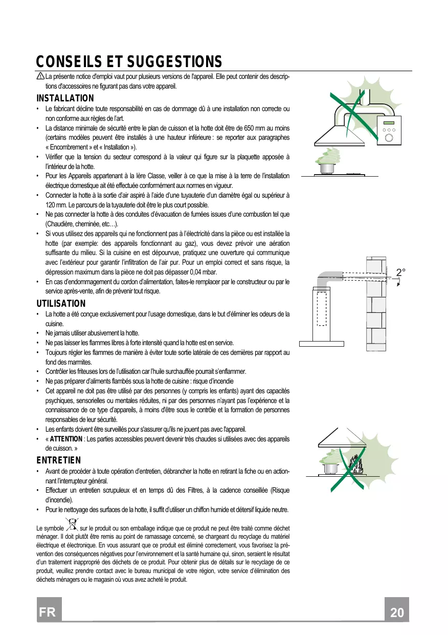 - Effectuer un entretien scrupuleux et en temps des filtres, à la cadence conseillée (Risque d'incendie). Pour le nettoyage des surfaces de la hotte, il suffit d'utiliser un chiffon humide et détergent liquide neutre.