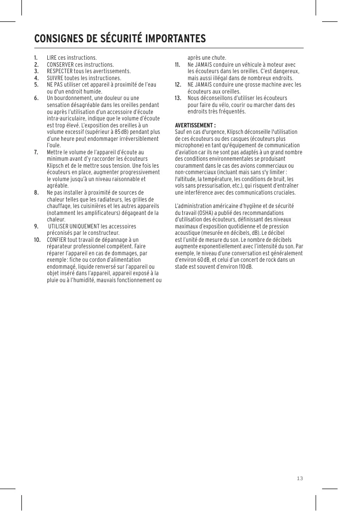 CONSIGNES DE SÉCURITÉ IMPORTANTES LIRE ces instructions. CONSERVER ces instructions. RESPECTER tous les avertissements. SUIVRE toutes les instructiones. NE PAS utiliser cet appareil à proximité de l’eau ou d'un endroit humide. 6. Un bourdonnement, une douleur ou une sensation désagréable dans les oreilles pendant ou après l’utilisation d’un accessoire d’écoute intra-auriculaire, indique que le volume d’écoute est trop élevé. L’exposition des oreilles à un volume excessif (supérieur à 85 dB) pendant plus d’une heure peut endommager irréversiblement l’ouïe. 7. Mettre le volume de l’appareil d’écoute au minimum avant d’y raccorder les écouteurs Klipsch et de le mettre sous tension. Une fois les écouteurs en place, augmenter progressivement le volume jusqu’à un niveau raisonnable et agréable. 8. Ne pas installer à proximité de sources de chaleur telles que les radiateurs, les grilles de chauffage, les cuisinières et les autres appareils (notamment les amplificateurs) dégageant de la chaleur. 9. UTILISER UNIQUEMENT les accessoires préconisés par le constructeur. 10. CONFIER tout travail de dépannage à un réparateur professionnel compétent. Faire réparer l’appareil en cas de dommages, par exemple : fiche ou cordon d’alimentation endommagé, liquide renversé sur l’appareil ou objet inséré dans l’appareil, appareil exposé à la pluie ou à l’humidité, mauvais fonctionnement ou 1. 2. 3. 4. 5.