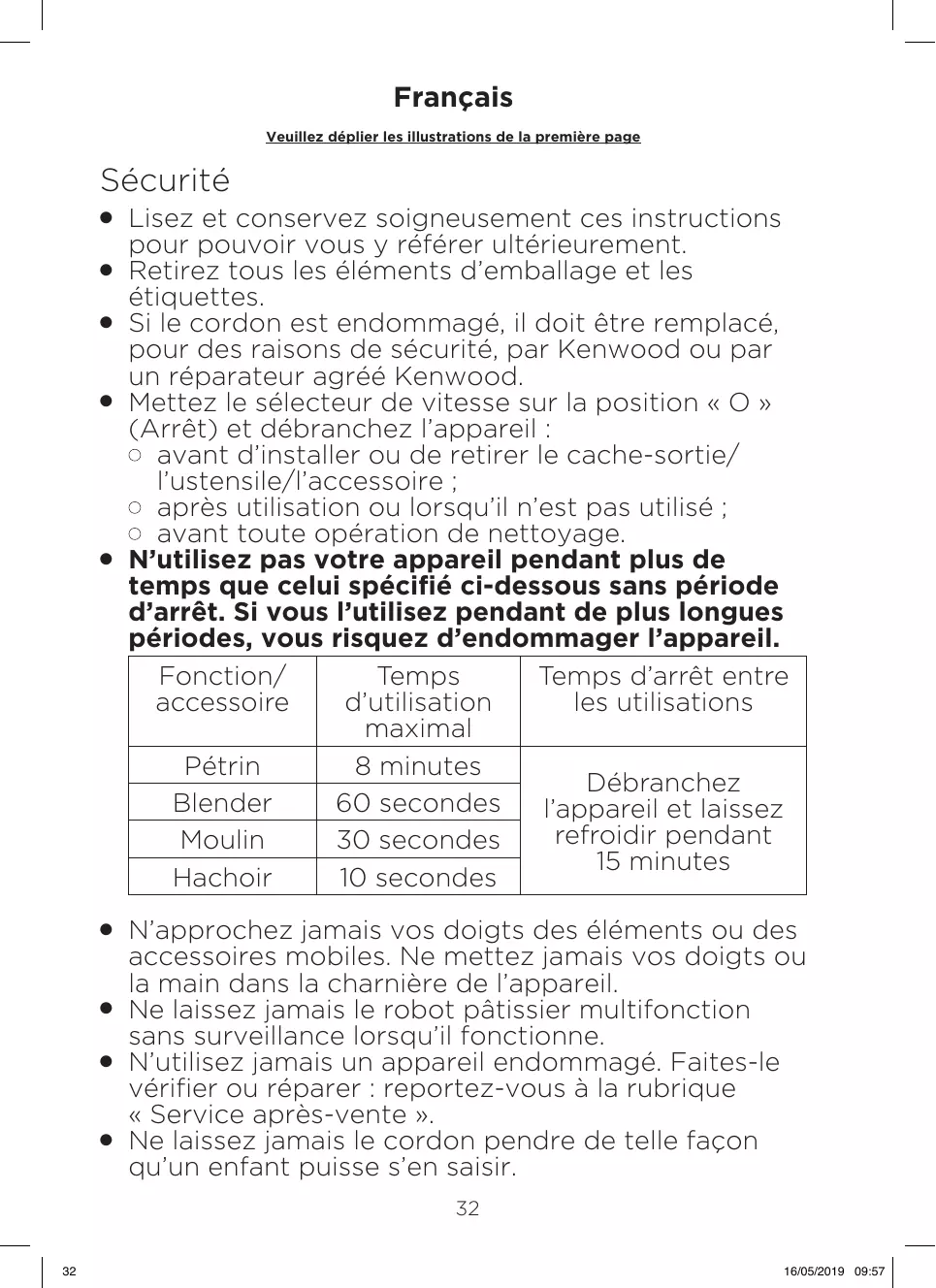 Lisez et conservez soigneusement ces instructions pour pouvoir vous y référer ultérieurement. Retirez tous les éléments d’emballage et les étiquettes. Si le cordon est endommagé, il doit être remplacé, pour des raisons de sécurité, par Kenwood ou par un réparateur agréé Kenwood. Mettez le sélecteur de vitesse sur la position « O » (Arrêt) et débranchez l’appareil : avant d’installer ou de retirer le cache-sortie/ l’ustensile/l’accessoire ; après utilisation ou lorsqu’il n’est pas utilisé ; avant toute opération de nettoyage. N’utilisez pas votre appareil pendant plus de temps que celui spécifié ci-dessous sans période d’arrêt. Si vous l’utilisez pendant de plus longues périodes, vous risquez d’endommager l’appareil. Fonction/ Temps Temps d’arrêt entre accessoire d’utilisation les utilisations maximal Pétrin 8 minutes Débranchez Blender 60 secondes l’appareil et laissez refroidir pendant Moulin 30 secondes 15 minutes Hachoir 10 secondes N’approchez jamais vos doigts des éléments ou des accessoires mobiles. Ne mettez jamais vos doigts ou la main dans la charnière de l’appareil. Ne laissez jamais le robot pâtissier multifonction sans surveillance lorsqu’il fonctionne. N’utilisez jamais un appareil endommagé. Faites-le vérifier ou réparer : reportez-vous à la rubrique « Service après-vente ». Ne laissez jamais le cordon pendre de telle façon qu’un enfant puisse s’en saisir.