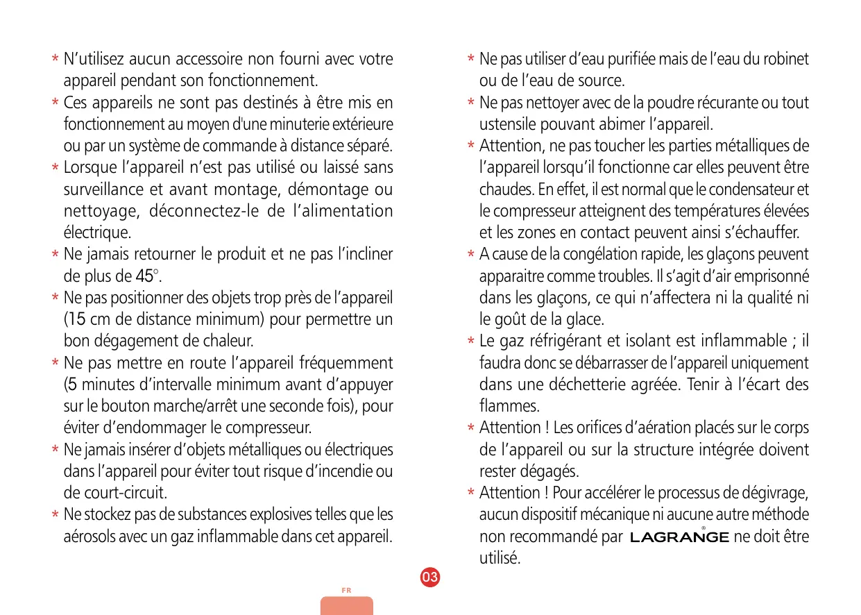 **N’utilisez aucun accessoire non fourni avec votre appareil pendant son fonctionnement. **Ces appareils ne sont pas destinés à être mis en fonctionnement au moyen d'une minuterie extérieure ou par un système de commande à distance séparé. **Lorsque l’appareil n’est pas utilisé ou laissé sans surveillance et avant montage, démontage ou nettoyage, déconnectez-le de l’alimentation électrique. **Ne jamais retourner le produit et ne pas l’incliner de plus de 45°. **Ne pas positionner des objets trop près de l’appareil (15 cm de distance minimum) pour permettre un bon dégagement de chaleur. **Ne pas mettre en route l’appareil fréquemment (5 minutes d’intervalle minimum avant d’appuyer sur le bouton marche/arrêt une seconde fois), pour éviter d’endommager le compresseur. **Ne jamais insérer d’objets métalliques ou électriques dans l’appareil pour éviter tout risque d’incendie ou de court-circuit. **Ne stockez pas de substances explosives telles que les aérosols avec un gaz inflammable dans cet appareil. **Ne pas utiliser d’eau purifiée mais de l’eau du robinet ou de l’eau de source. **Ne pas nettoyer avec de la poudre récurante ou tout ustensile pouvant abimer l’appareil. **Attention, ne pas toucher les parties métalliques de l’appareil lorsqu’il fonctionne car elles peuvent être chaudes. En effet, il est normal que le condensateur et le compresseur atteignent des températures élevées et les zones en contact peuvent ainsi s’échauffer. **A cause de la congélation rapide, les glaçons peuvent apparaitre comme troubles. Il s’agit d’air emprisonné dans les glaçons, ce qui n’affectera ni la qualité ni le goût de la glace. **Le gaz réfrigérant et isolant est inflammable ; il faudra donc se débarrasser de l’appareil uniquement dans une déchetterie agréée. Tenir à l’écart des flammes. **Attention ! Les orifices d’aération placés sur le corps de l’appareil ou sur la structure intégrée doivent rester dégagés. **Attention ! Pour accélérer le processus de dégivrage, aucun dispositif mécanique ni aucune autre méthode non recommandé par ne doit être utilisé.