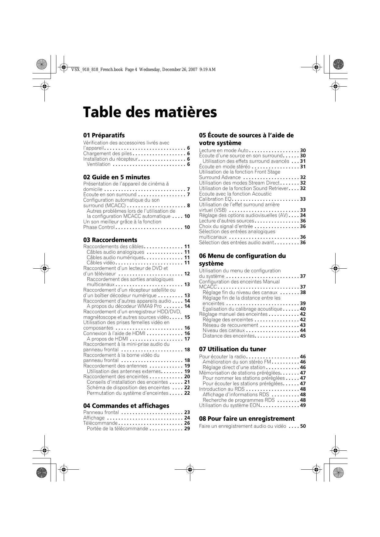 MULTI-CANAUX VSX_918_818_French.book Page 4 Wednesday, December 26, 2007 9:19 AM Table des matières 01 Préparatifs Vérification des accessoires livrés avec l’appareil... Chargement des piles ... Installation du récepteur ... Ventilation ...