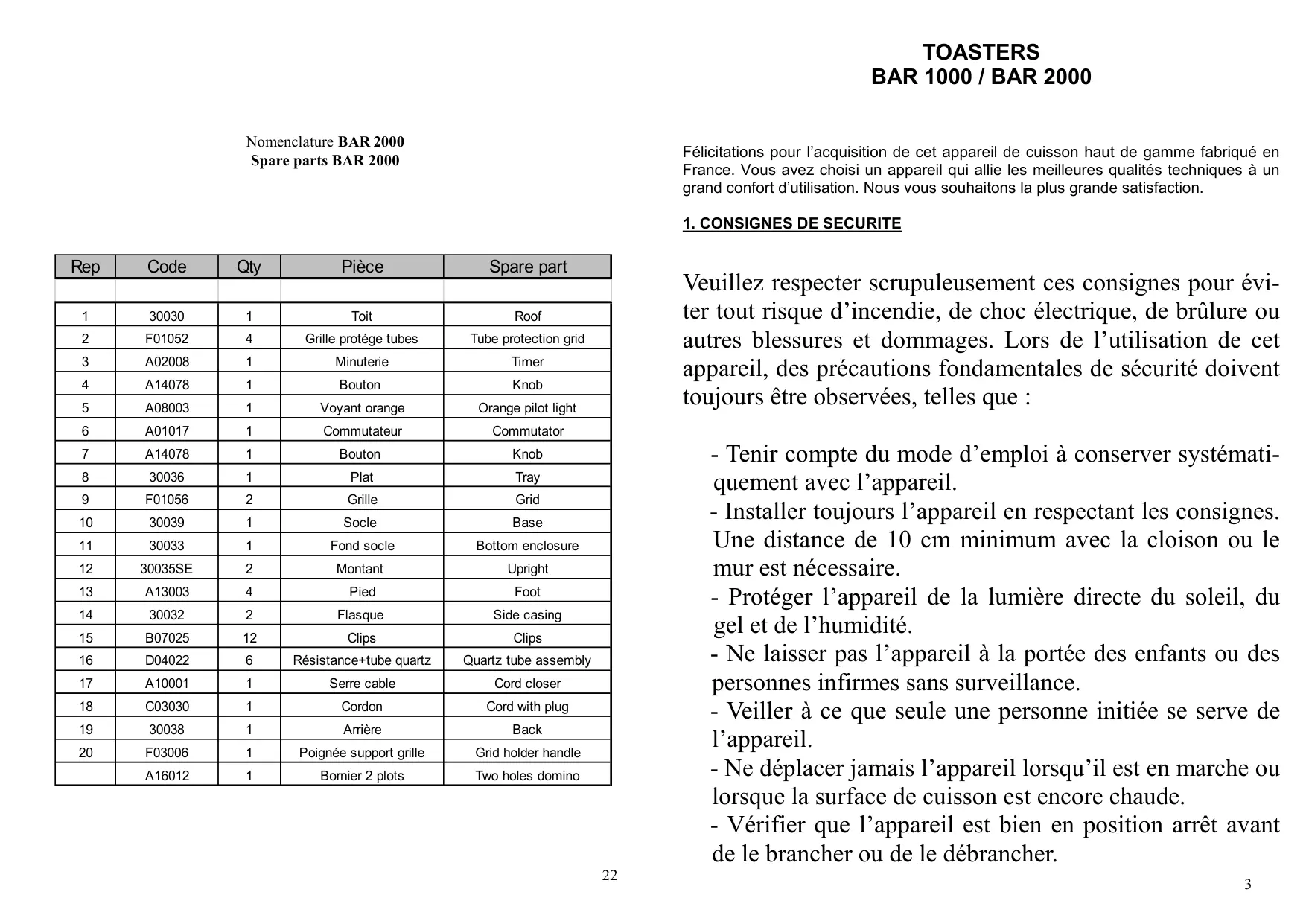 - Une grille de cuisson (BAR1000) - Deux grilles de cuisson (BAR 2000) - Une poignée décroche grille (BAR 1000/BAR 2000) - La présente notice