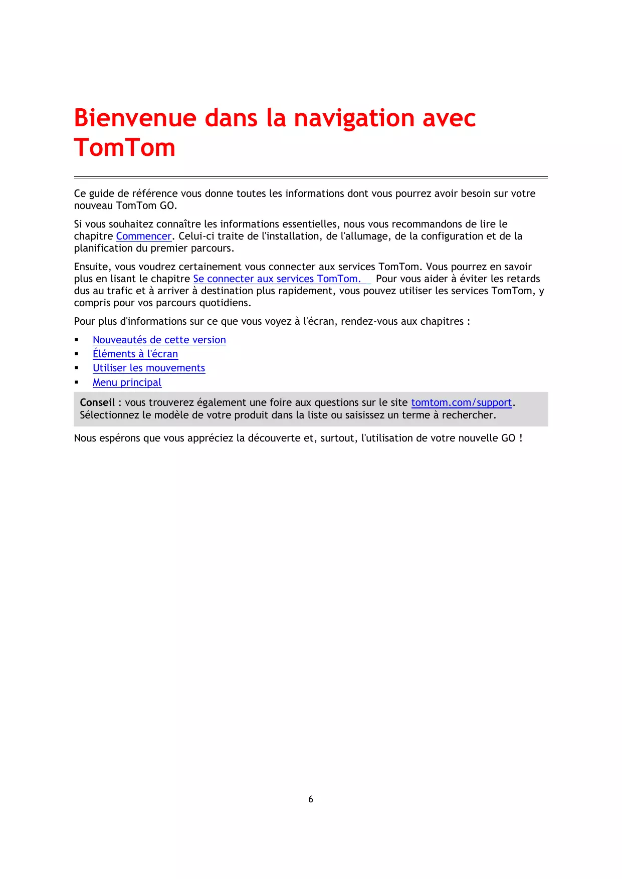 Nouveautés de cette version Éléments à l'écran Utiliser les mouvements Menu principal Conseil : vous trouverez également une foire aux questions sur le site tomtom.com/support. Sélectionnez le modèle de votre produit dans la liste ou saisissez un terme à rechercher. Nous espérons que vous appréciez la découverte et, surtout, l'utilisation de votre nouvelle GO !
