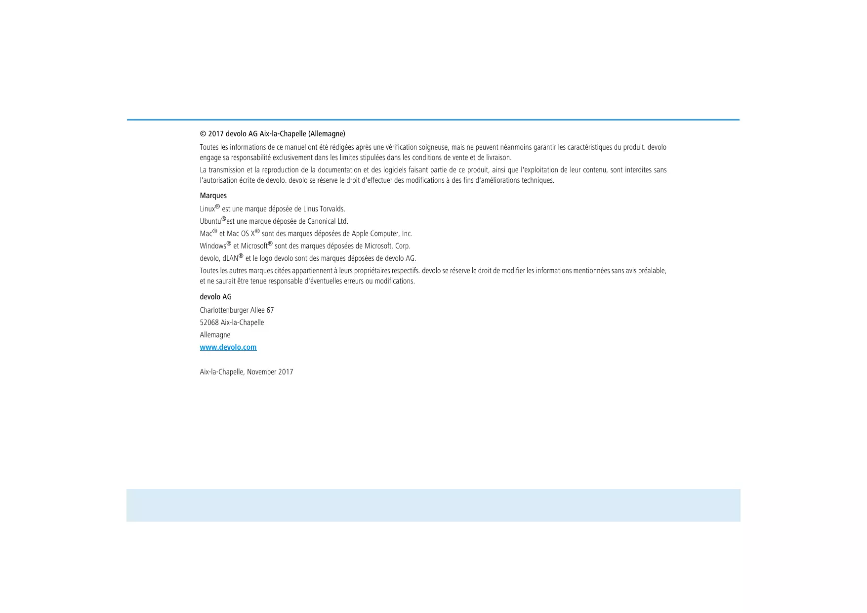 • devolo dLAN 1200+ © 2017 devolo AG Aix-la-Chapelle (Allemagne) Toutes les informations de ce manuel ont été rédigées après une vérification soigneuse, mais ne peuvent néanmoins garantir les caractéristiques du produit. devolo engage sa responsabilité exclusivement dans les limites stipulées dans les conditions de vente et de livraison. La transmission et la reproduction de la documentation et des logiciels faisant partie de ce produit, ainsi que l'exploitation de leur contenu, sont interdites sans l'autorisation écrite de devolo. devolo se réserve le droit d'effectuer des modifications à des fins d'améliorations techniques. Marques Linux® est une marque déposée de Linus Torvalds. Ubuntu®est une marque déposée de Canonical Ltd. Mac® et Mac OS X® sont des marques déposées de Apple Computer, Inc. Windows® et Microsoft® sont des marques déposées de Microsoft, Corp. devolo, dLAN® et le logo devolo sont des marques déposées de devolo AG. Toutes les autres marques citées appartiennent à leurs propriétaires respectifs. devolo se réserve le droit de modifier les informations mentionnées sans avis préalable, et ne saurait être tenue responsable d'éventuelles erreurs ou modifications. devolo AG Charlottenburger Allee 67 52068 Aix-la-Chapelle Allemagne www.devolo.com Aix-la-Chapelle, November 2017 Contenu Contenu 1 Avant-propos p. 6