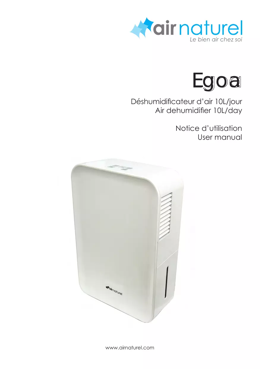 Egoa Déshumidificateur d’air 10L/jour Air dehumidifier 10L/day Notice d’utilisation User manual www.airnaturel.com FRANÇAIS Merci d’avoir acheté le déshumidificateur d’air Egoa, un produit Air Naturel. Nous espérons qu’il vous donnera entière satisfaction et améliorera la qualité de votre air intérieur. Comme pour tous les appareils ménagers électriques, il est important d’entretenir cet appareil correctement afin d’éviter d’éventuels blessures ou dommages. Merci de lire attentivement les instructions avant de le mettre en fonctionnement et conserver cette notice pour référence ultérieure. Informations importantes de sécurité Placer l’appareil hors de portée les enfants. Ne pas laisser les enfants utiliser l’appareil seuls. Ne pas laisser les enfants jouer avec l’emballage (sac plastique, etc.). Il convient de surveiller les enfants pour s’assurer qu’ils ne jouent pas avec l’appareil. L'appareil est prévu pour une utilisation domestique uniquement, à l'exclusion de toute utilisation industrielle ou commerciale. Cet appareil n’est pas prévu pour être utilisé par des personnes (y compris les enfants) dont les capacités physiques, sensorielles ou mentales sont réduites, ou des personnes dénuées d’expérience ou de connaissances du produit, sauf si elles ont pu bénéficier, par l’intermédiaire d’une personne responsable de leur sécurité, d’une surveillance ou d’instructions préalables concernant l’utilisation de l’appareil. Ne pas introduire d’objet métallique dans l’appareil. Cet appareil est prévu pour fonctionner dans une habitation. Ne pas mouiller l’appareil. Le nettoyer avec un chiffon humide et bien le sécher avant de le rebrancher et de le remettre en fonctionnement. L’appareil fonctionne sous 220-240 volts. Pour se protéger des incendies et des risques de chocs électriques, ne pas connecter l’appareil à un voltage différent. Ne pas changer le câble d'alimentation ou brancher l'appareil sur une prise multiple. Ne pas couvrir l’appareil. Ne pas utiliser l’appareil s’il est endommagé. En cas d’apparition de bruits inhabituels ou de tout signe suspect, débrancher l’appareil et contacter le revendeur. Ne pas boire ou utiliser l'eau collectée dans le réservoir. Placer l’appareil au sol, sur une surface plane et sèche. Éviter les surfaces avec du nylon ou inflammables, les radiateurs et autres sources de chaleur. Ne pas utiliser l'appareil à proximité de matières inflammables comme du gaz, de l'essence ou des solvants. Toujours débrancher l’appareil lors des opérations de nettoyage et de vidange du réservoir. Prévention des accidents domestiques Pour éviter le risque de choc électrique, ne pas exposer le câble d’alimentation à des surfaces humides ou mouillées. Ne pas tordre ou tirer de manière excessive sur le câble électrique, ni poser de choses lourdes dessus ; cela pourrait provoquer un court-circuit. La sécurité de cet appareil est conforme aux règles techniques et aux normes en vigueur au sein de l’UE. Pour tout autre information ou renseignement, veuillez consulter notre site internet : www.airnaturel.com Notre service clients est à votre écoute à l’adresse suivante : info@airnaturel.com