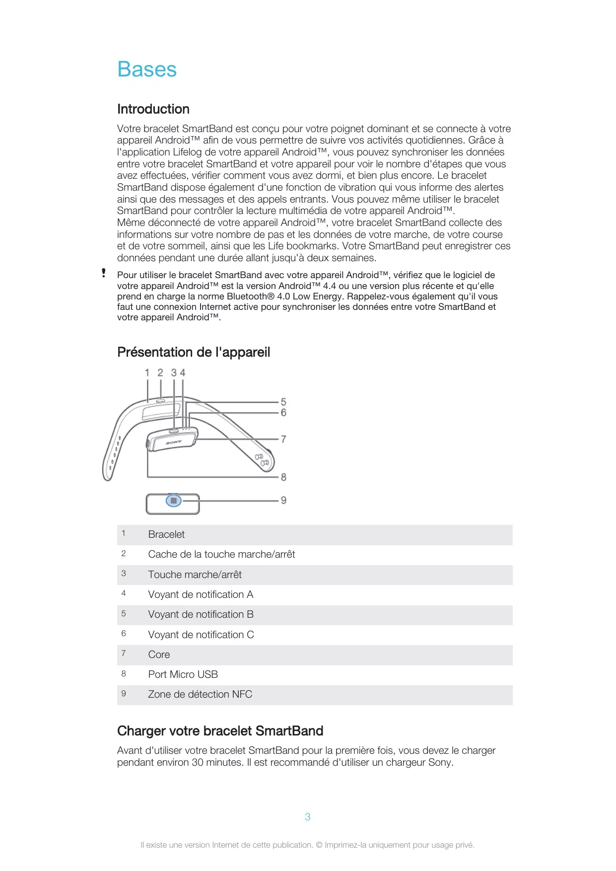 Bases Introduction Votre bracelet SmartBand est conçu pour votre poignet dominant et se connecte à votre appareil Android™ afin de vous permettre de suivre vos activités quotidiennes. Grâce à l'application Lifelog de votre appareil Android™, vous pouvez synchroniser les données entre votre bracelet SmartBand et votre appareil pour voir le nombre d'étapes que vous avez effectuées, vérifier comment vous avez dormi, et bien plus encore. Le bracelet SmartBand dispose également d'une fonction de vibration qui vous informe des alertes ainsi que des messages et des appels entrants. Vous pouvez même utiliser le bracelet SmartBand pour contrôler la lecture multimédia de votre appareil Android™. Même déconnecté de votre appareil Android™, votre bracelet SmartBand collecte des informations sur votre nombre de pas et les données de votre marche, de votre course et de votre sommeil, ainsi que les Life bookmarks. Votre SmartBand peut enregistrer ces données pendant une durée allant jusqu'à deux semaines. Pour utiliser le bracelet SmartBand avec votre appareil Android™, vérifiez que le logiciel de votre appareil Android™ est la version Android™ 4.4 ou une version plus récente et qu'elle prend en charge la norme Bluetooth® 4.0 Low Energy. Rappelez-vous également qu'il vous faut une connexion Internet active pour synchroniser les données entre votre SmartBand et votre appareil Android™.