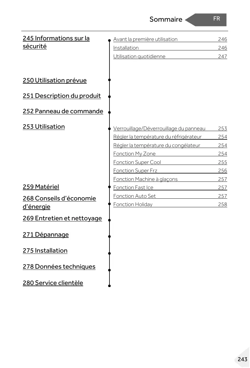 Régler la température du réfrigérateur Fonction My Zone Fonction Super Cool Fonction Super Frz 259 Matériel 268 Conseils d’économie d’énergie Fonction Machine à glaçons Fonction Fast Ice Fonction Auto Set Fonction Holiday