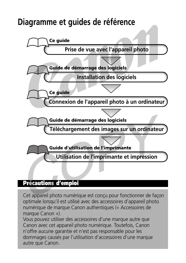 - Veuillez également consulter le Guide d’utilisation de l’imprimante fourni avec votre imprimante Canon. Diagramme et guides de référence Ce guide Prise de vue avec l'appareil photo Guide de démarrage des logiciels Installation des logiciels Ce guide Connexion de l'appareil photo à un ordinateur Guide de démarrage des logiciels Téléchargement des images sur un ordinateur Guide d'utilisation de l'imprimante Utilisation de l'imprimante et impression Précautions d’emploi Cet appareil photo numérique est conçu pour fonctionner de façon optimale lorsqu’il est utilisé avec des accessoires d’appareil photo numérique de marque Canon authentiques (« Accessoires de marque Canon »). Vous pouvez utiliser des accessoires d’une marque autre que Canon avec cet appareil photo numérique. Toutefois, Canon n’offre aucune garantie et n’est pas responsable pour les dommages causés par l’utilisation d’accessoires d’une marque autre que Canon.