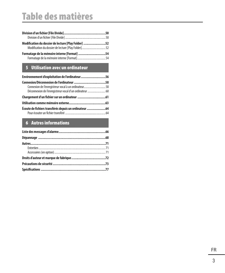 Notez qu'Olympus n'est pas responsable de la suppression ou de l'impossibilité de lecture des fichiers enregistrés provoquée par une défaillance de l'enregistreur vocal ou de l'ordinateur. - L'enregistrement de supports soumis à des droits d'auteur est uniquement autorisé en cas d'enregistrement dans le cadre d'une utilisation personnelle. Tout type d'utilisation sans la permission du détenteur des droits d'auteur est interdit par la législation relative aux droits d'auteur.