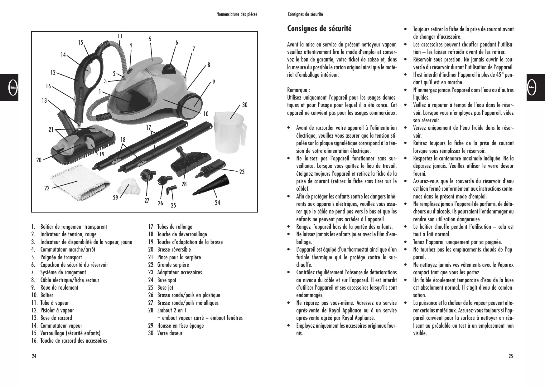 Caractéristiques techniques Garantie Caractéristiques techniques Garantie Tension électrique : Puissance : Pression de la vapeur : Contenance maxi du réservoir : Disponibilité de la vapeur : Prêt à l’emploi en : Système de protection : Accessoires : A compter de la date d’achat, nous accordons une garantie de 24 mois pour l’appareil que nous vendons. Accessoires intégrés : 230V/50 Hz 1500 watts nom. 3,0 bars 1,4 l 50 minutes maxi/plein d’eau env. 11 minutes protection contre la surchauffe 2 tubes de rallonge Buse réversible Grande serpière pour la brosse réversible Adaptateur accessoires Verre doseur Brosse ronde/poils métalliques Brosse ronde/poils en plastique Buse spot Buse jet Embout 2 en 1 = buse manuelle, housse et embout fenêtres Durant toute cette période de garantie, nous supprimons gratuitement tous les vices de matériel et de construction, à notre bon gré, soit en les réparant, soit en échangeant l’appareil ou les accessoires* (* les détériorations au niveau des accessoires n’entraînent pas automatiquement l’échange de l’appareil entier). Les détériorations consécutives à une utilisation incorrecte (utilisation avec un type/une tension de courant inapproprié, branchement sur une source de courant inappropriée, casse. etc.), l’usure normale ainsi que les vices n’altérant que de manière moindre la valeur ou l’aptitude à l’emploi de l’appareil sont exclus de la garantie. La garantie expire en cas d’intervention par un service non autorisé et en cas d’utilisation de pièces de rechange autres que les pièces originales de Royal Appliance. Les pièces d’usure ne sont pas couvertes par la garantie et ne sont donc pas gratuites ! En cas de sinistre couvert par la garantie : Envoyez l’appareil prêt à l’expédition dans son emballage affranchi au tarif en vigueur en veillant à vider au préalable son réservoir et en joignant une brève description de la panne en lettres d’imprimerie portant la mention « Garantie » ainsi que la carte de garantie ou une copie de la facture à l’adresse suivante : Royal Appliance International GmbH Service clientèle Itterpark 9 40724 Hilden Allemagne Tél. : +49(0) 21 03 - 20 07 10 Fax : +49(0) 21 03 - 20 07 77 La garantie est uniquement valable lorsque le vendeur a confirmé la date d’achat en apposant son cachet et sa signature sur la carte de garantie ou qu’une copie de la facture est jointe lors de l’ordre de réparation. Les prestations de la garantie ne prolongent pas la durée de la garantie et ne donnent pas non plus droit à une nouvelle garantie !