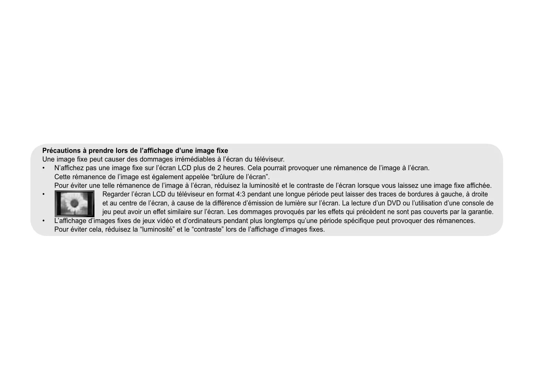 Précautions à prendre lors de l’affichage d’une image fixe Une image fixe peut causer des dommages irrémédiables à l’écran du téléviseur. • N’affichez pas une image fixe sur l’écran LCD plus de 2 heures. Cela pourrait provoquer une rémanence de l’image à l’écran. Cette rémanence de l’image est également appelée “brûlure de l’écran”. Pour éviter une telle rémanence de l’image à l’écran, réduisez la luminosité et le contraste de l’écran lorsque vous laissez une image fixe affichée. Regarder l’écran LCD du téléviseur en format 4:3 pendant une longue période peut laisser des traces de bordures à gauche, à droite • et au centre de l’écran, à cause de la différence d’émission de lumière sur l’écran. La lecture d’un DVD ou l’utilisation d’une console de jeu peut avoir un effet similaire sur l’écran. Les dommages provoqués par les effets qui précèdent ne sont pas couverts par la garantie. • L’affichage d’images fixes de jeux vidéo et d’ordinateurs pendant plus longtemps qu’une période spécifique peut provoquer des rémanences. Pour éviter cela, réduisez la “luminosité” et le “contraste” lors de l’affichage d’images fixes.