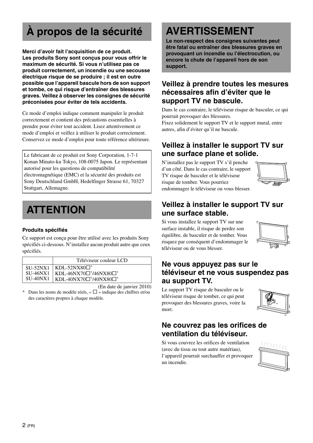 Merci d'avoir fait l'acquisition de ce produit. Les produits Sony sont conçus pour vous offrir le maximum de sécurité. Si vous n'utilise pas ce produit correctement, un incendie ou une secousse électrique risque de se produit ; il est en outre possible que l'appareil bascule hors de son support et tombe, ce qui risque d'entrainer des blessures graves. Veillez à observer les consignes de sécurité préconisées pour éviter de tels accidents.