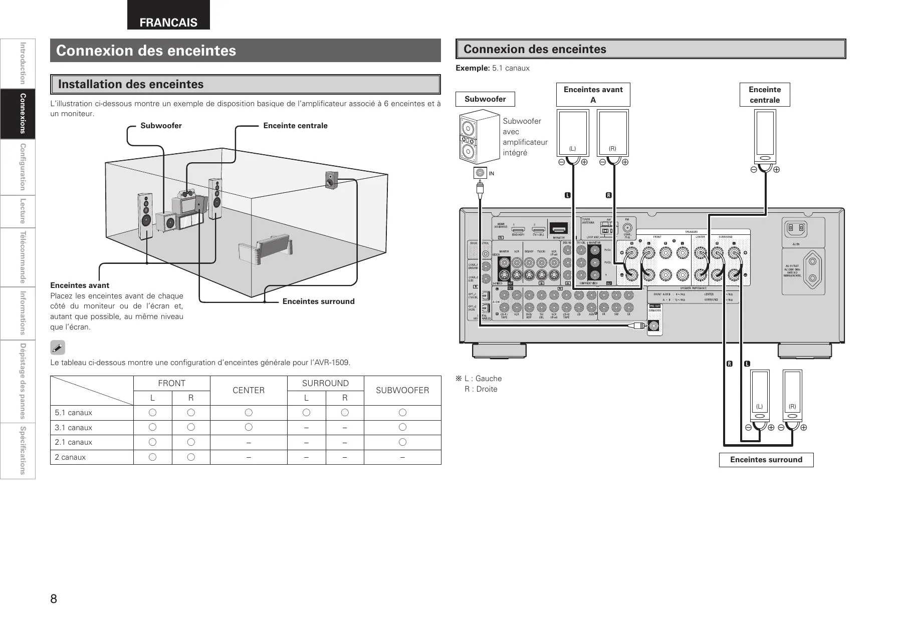 Le tableau ci-dessous montre une configuration d’enceintes générale pour l’AVR-1509.