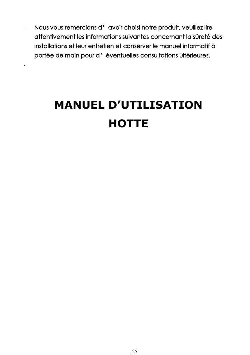 - Veuillez lire le présent manuel d’utilisation avant d’installer et d’utiliser la hotte. Et veuillez garder le manuel d’utilisation en sécurité pour consultation ultérieure.