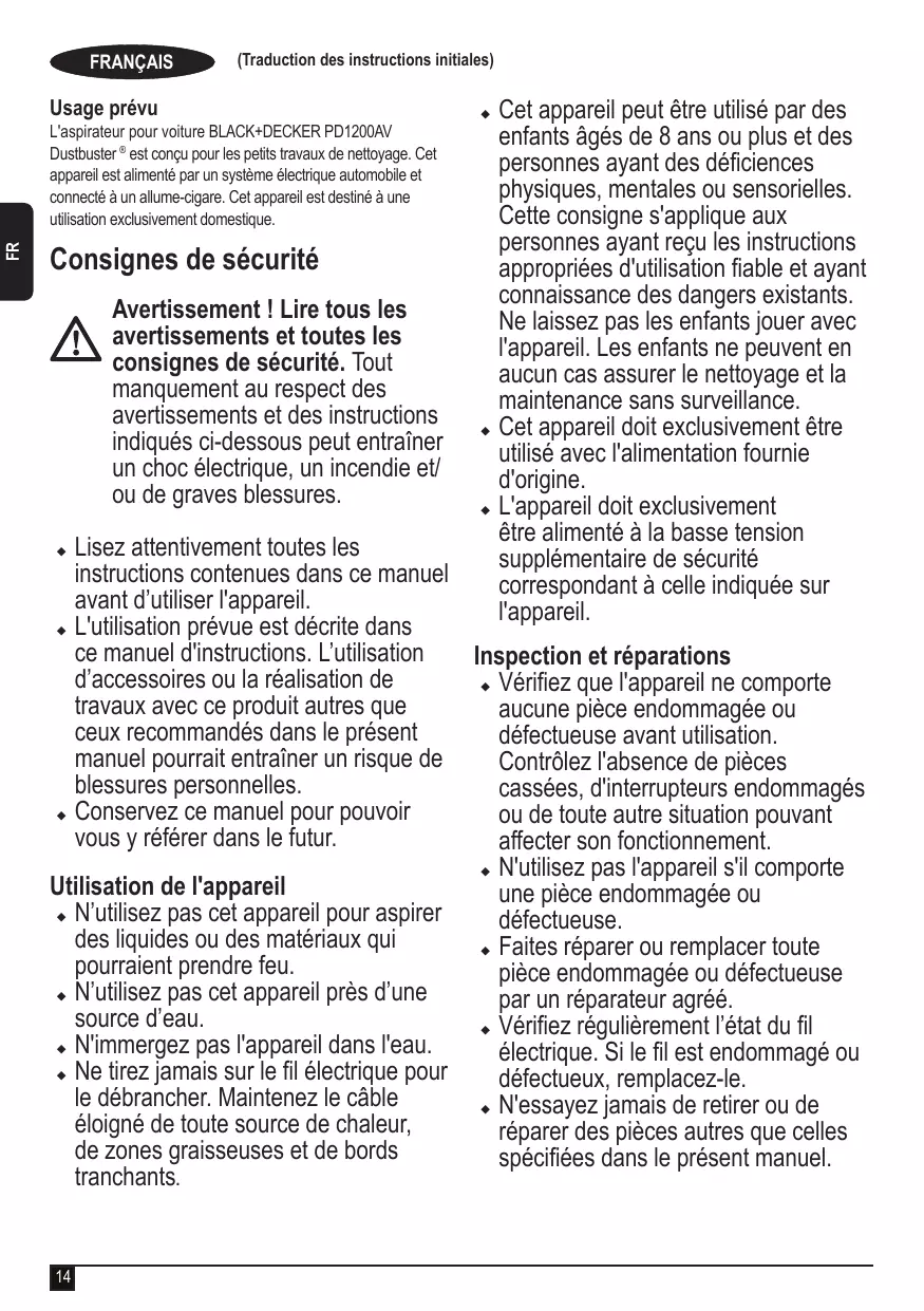 L'aspirateur pour voiture BLACK+DECKER PD1200AV Dustbuster ® est conçu pour les petits travaux de nettoyage. Cet appareil est alimenté par un système électrique automobile et connecté à un allume-cigare. Cet appareil est destiné à une utilisation exclusivement domestique.