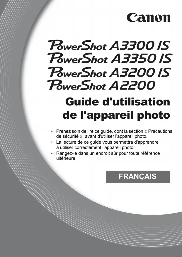 • : opérations nécessitant une attention particulière • : conseils pour la résolution des pannes • : astuces pour tirer le meilleur parti de l'appareil photo • : informations complémentaires • (p. xx) : pages de référence (« xx » représente le numéro de page) • Ce guide part du principe que toutes les fonctions sont réglées sur les valeurs par défaut. • Dans le présent guide, les différents types de cartes mémoire susceptibles d'être utilisés avec cet appareil photo sont appelés collectivement « cartes mémoire ». • Les fonctions qui diffèrent suivant le modèle d'appareil photo sont indiquées par les icônes suivantes : A3300 IS Fonctions et précautions relatives aux PowerShot A3300 et A3350 IS uniquement. A3200 IS Fonctions et précautions relatives au PowerShot A3200 IS uniquement. A2200 Fonctions et précautions relatives au PowerShot A2200 uniquement. Les explications dépourvues de ces icônes concernent les trois modèles. • Les explications proposées dans ce guide se basent sur les captures d'écran et les illustrations du PowerShot A3300 IS.