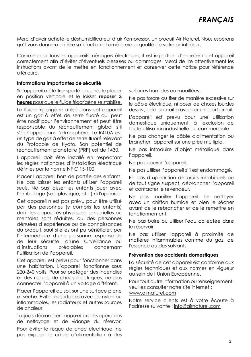 Kompressor Notice d’utilisation Déshumidificateur d’air 40L/jour (pompe de relevage intégrée) User manual Air dehumidifier 40L/day (built-in drain pump) Bedienungsanleitung Luftentfeuchter 40L/Tag (eingebaute Kondensatpumpe) www.airnaturel.com FRANÇAIS Merci d’avoir acheté le déshumidificateur d’air Kompressor, un produit Air Naturel. Nous espérons qu’il vous donnera entière satisfaction et améliorera la qualité de votre air intérieur. Comme pour tous les appareils ménagers électriques, il est important d’entretenir cet appareil correctement afin d’éviter d’éventuels blessures ou dommages. Merci de lire attentivement les instructions avant de le mettre en fonctionnement et conserver cette notice pour référence ultérieure. Informations importantes de sécurité Si l’appareil a été transporté couché, le placer en position verticale et le laisser reposer 3 heures pour que le fluide frigorigène se stabilise. Le fluide frigorigène utilisé dans cet appareil est un gaz à effet de serre fluoré qui peut être nocif pour l’environnement et peut être responsable du réchauffement global s’il s’échappe dans l’atmosphère. Le R410A est un type de gaz à effet de serre fluoré relevant du Protocole de Kyoto. Son potentiel de réchauffement planétaire (PRP) est de 1430. L’appareil doit être installé en respectant les règles nationales d’installation électrique définies par la norme NF C 15-100. Placer l’appareil hors de portée des enfants. Ne pas laisser les enfants utiliser l’appareil seuls. Ne pas laisser les enfants jouer avec l’emballage (sac plastique, etc.) ni l'appareil. Cet appareil n’est pas prévu pour être utilisé par des personnes (y compris les enfants) dont les capacités physiques, sensorielles ou mentales sont réduites, ou des personnes dénuées d’expérience ou de connaissances du produit, sauf si elles ont pu bénéficier, par l’intermédiaire d’une personne responsable de leur sécurité, d’une surveillance ou d’instructions préalables concernant l’utilisation de l’appareil. Cet appareil est prévu pour fonctionner dans une habitation. L’appareil fonctionne sous 220-240 volts. Pour se protéger des incendies et des risques de chocs électriques, ne pas connecter l’appareil à un voltage différent. Placer l’appareil au sol, sur une surface plane et sèche. Éviter les surfaces avec du nylon ou inflammables, les radiateurs et autres sources de chaleur. surfaces humides ou mouillées. Ne pas tordre ou tirer de manière excessive sur le câble électrique, ni poser de choses lourdes dessus ; cela pourrait provoquer un court-circuit. L'appareil est prévu pour une utilisation domestique uniquement, à l'exclusion de toute utilisation industrielle ou commerciale Ne pas changer le câble d'alimentation ou brancher l'appareil sur une prise multiple. Ne pas introduire d’objet métallique dans l’appareil. Ne pas couvrir l’appareil. Ne pas utiliser l’appareil s’il est endommagé. En cas d’apparition de bruits inhabituels ou de tout signe suspect, débrancher l’appareil et contacter le revendeur. Ne pas mouiller l’appareil. Le nettoyer avec un chiffon humide et bien le sécher avant de le rebrancher et de le remettre en fonctionnement. Ne pas boire ou utiliser l'eau collectée dans le réservoir. Ne pas utiliser l'appareil à proximité de matières inflammables comme du gaz, de l'essence ou des solvants. Prévention des accidents domestiques La sécurité de cet appareil est conforme aux règles techniques et aux normes en vigueur au sein de l’Union Européenne. Pour tout autre information ou renseignement, veuillez consulter notre site internet : www.airnaturel.com Notre service clients est à votre écoute à l’adresse suivante : info@airnaturel.com Toujours débrancher l’appareil lors des opérations de nettoyage et de vidange du réservoir. Pour éviter le risque de choc électrique, ne pas exposer le câble d’alimentation à des