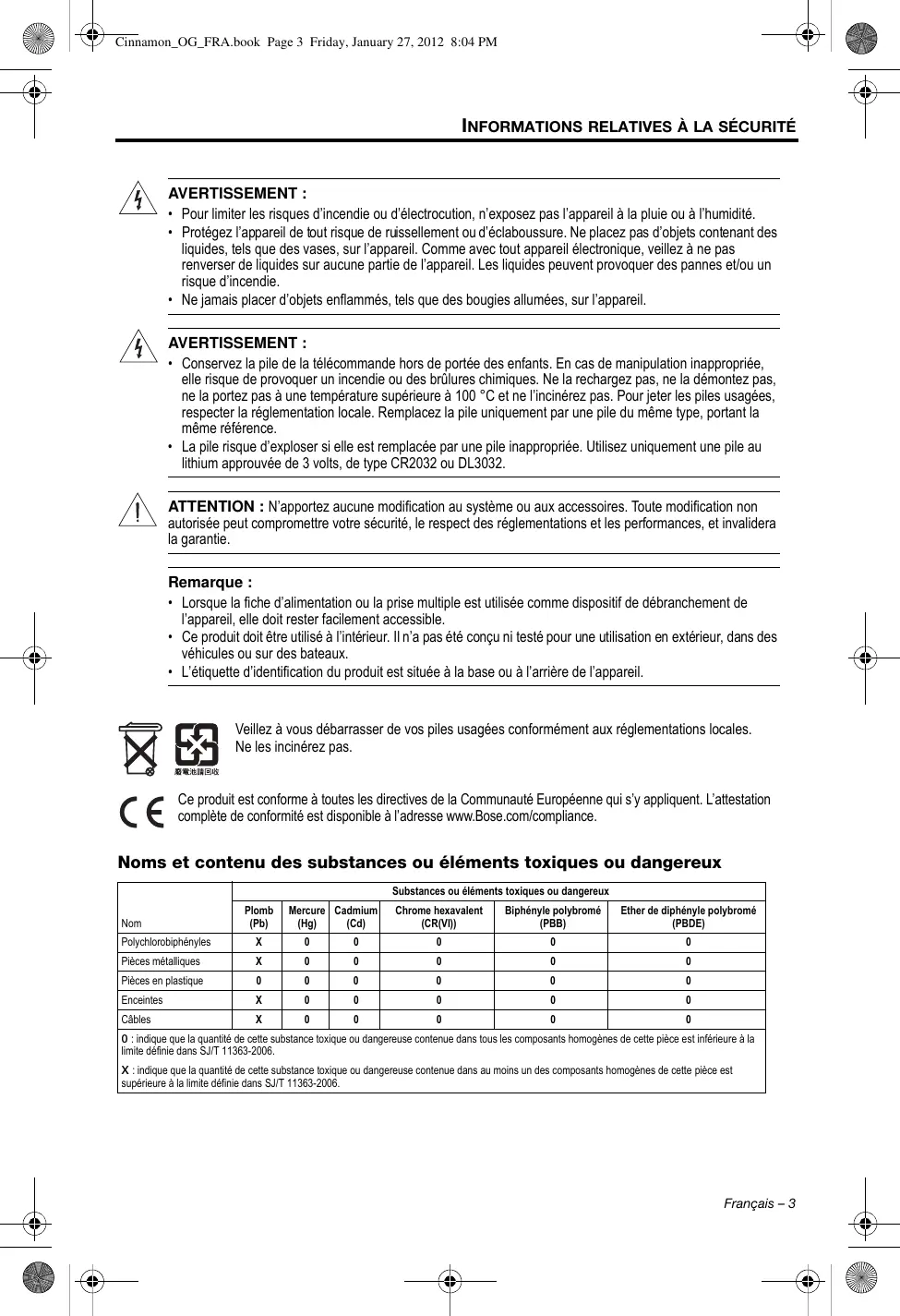 Toute modification non autorisée expressément par Bose Corporation est susceptible d'annuler le droit de l'utilisateur à mettre en œuvre celui-ci.