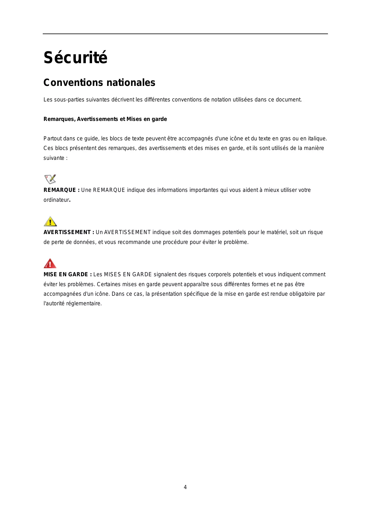 Sécurité Conventions nationales Les sous-parties suivantes décrivent les différentes conventions de notation utilisées dans ce document. Remarques, Avertissements et Mises en garde Partout dans ce guide, les blocs de texte peuvent être accompagnés d'une icône et du texte en gras ou en italique. Ces blocs présentent des remarques, des avertissements et des mises en garde, et ils sont utilisés de la manière suivante : REMARQUE : Une REMARQUE indique des informations importantes qui vous aident à mieux utiliser votre ordinateur.