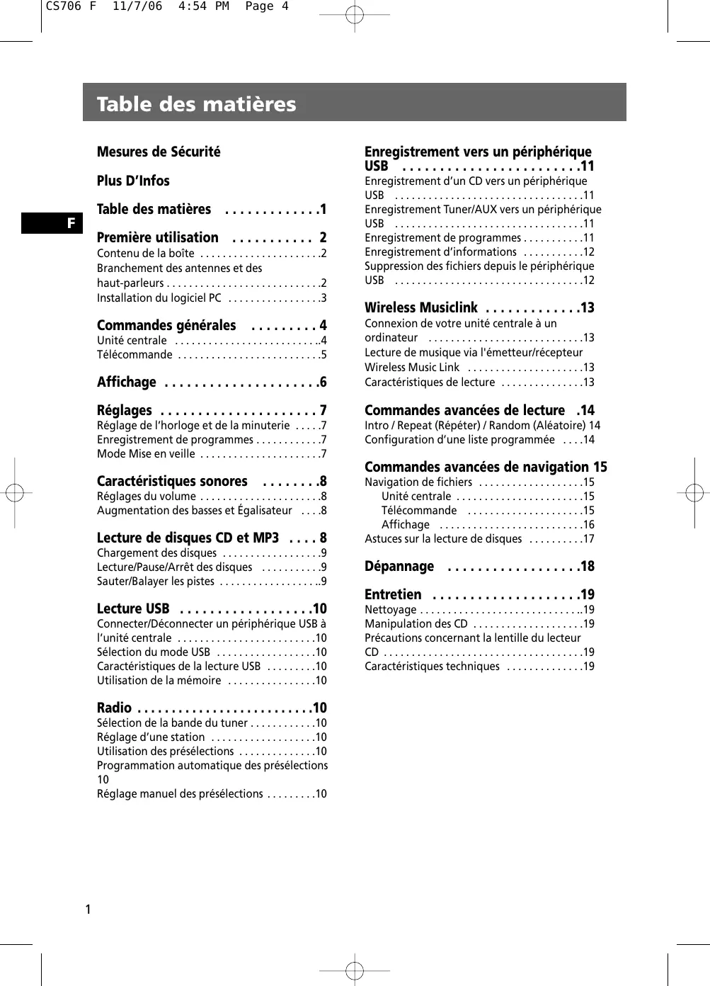- Caractéristiques techniques CS706 F 11/8/06 5:46 PM Page 5 Première utilisation Contenu de la boîte p. 19