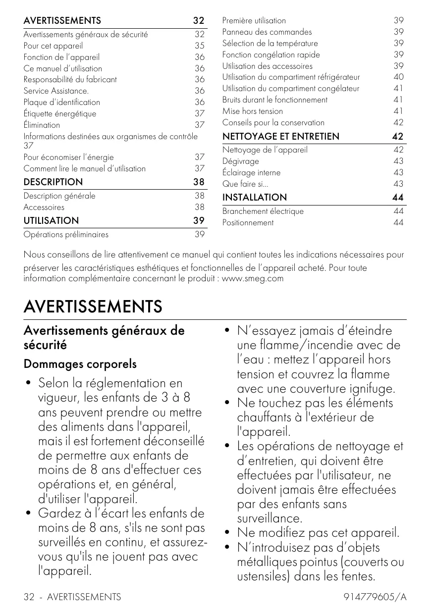 Nous conseillons de dire attentivement ce manuel qui contient toutes les indications nécessaires pour préserver les caractéristiques esthétiques et fonctionnelles de l'appareil acheté. Pour toute information complémentaire concernant le produit : www.smeg.com