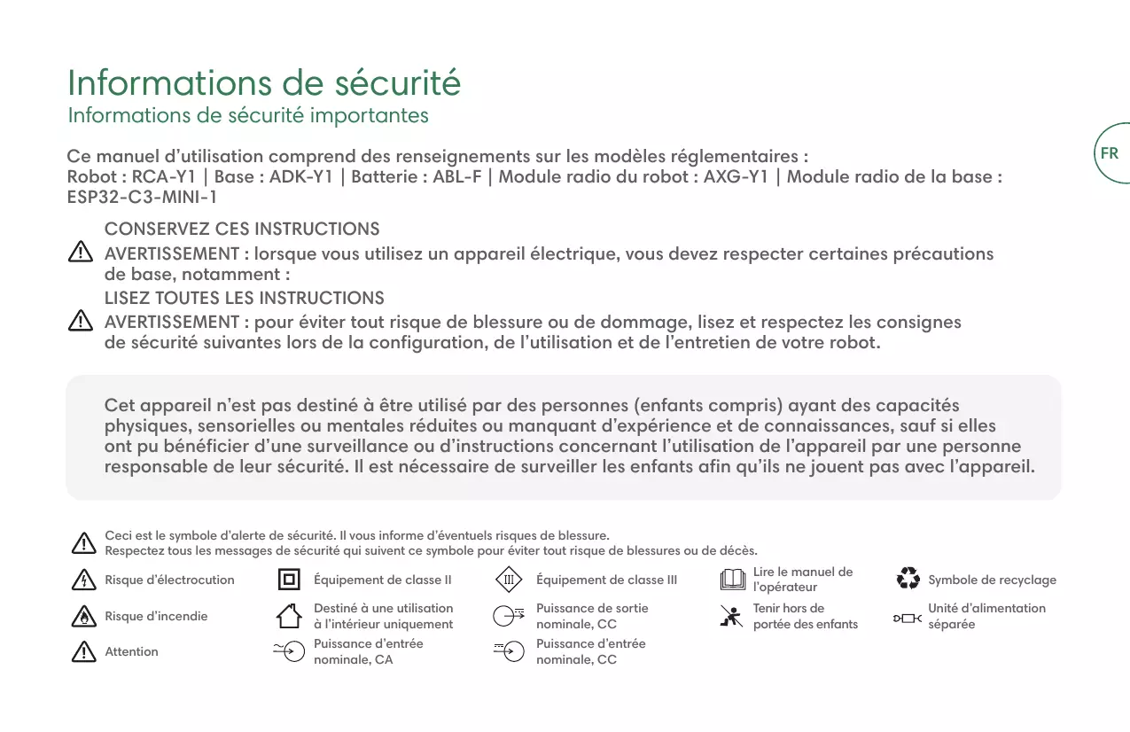 Apple and App Store are trademarks of Apple Inc., registered in the US and other countries. Google Play is a trademark of Google LLC. Robot : RCA-Y1 | Base : ADK-Y1 | Batterie : ABL-F | Module radio du robot : AXG-Y1 | Module radio de la base : ESP32-C3-MINI-1 CONSERVEZ CES INSTRUCTIONS AVERTISSEMENT : lorsque vous utilisez un appareil électrique, vous devez respecter certaines précautions de base, notamment : LISEZ TOUTES LES INSTRUCTIONS AVERTISSEMENT : pour éviter tout risque de blessure ou de dommage, lisez et respectez les consignes de sécurité suivantes lors de la configuration, de l’utilisation et de l’entretien de votre robot. Cet appareil n’est pas destiné à être utilisé par des personnes (enfants compris) ayant des capacités physiques, sensorielles ou mentales réduites ou manquant d’expérience et de connaissances, sauf si elles ont pu bénéficier d’une surveillance ou d’instructions concernant l’utilisation de l’appareil par une personne responsable de leur sécurité. Il est nécessaire de surveiller les enfants afin qu’ils ne jouent pas avec l’appareil.