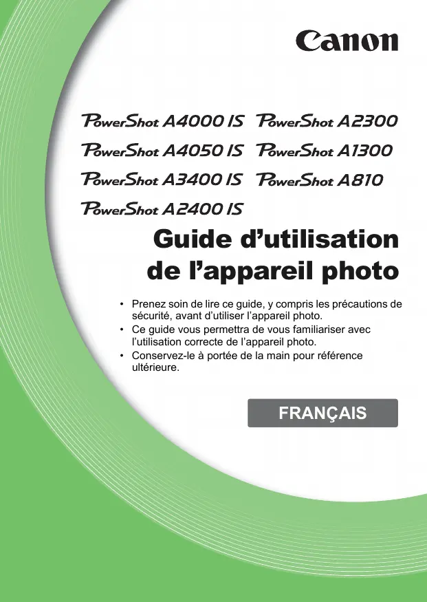 - Les icônes suivantes sont utilisées pour indiquer les fonctions qui diffèrent selon le modèle d’appareil photo : A4000 IS Fonctions et précautions d’utilisation du PowerShot A4000 IS et du PowerShot A4050 IS A3400 IS Fonctions et précautions relatives au PowerShot A3400 IS uniquement A2400 IS Fonctions et précautions relatives au PowerShot A2400 IS uniquement A2300 Fonctions et précautions relatives au PowerShot A2300 uniquement A1300 Fonctions et précautions relatives au PowerShot A1300 uniquement