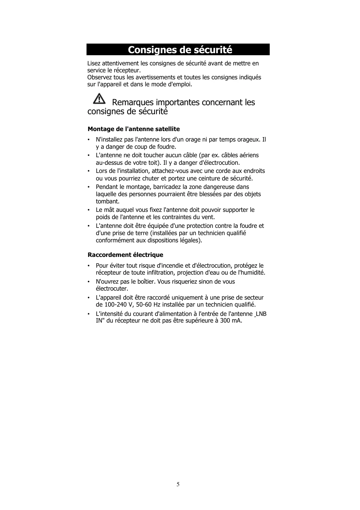 Lisez attentivement les consignes de sécurité avant de mettre en service le récepteur.