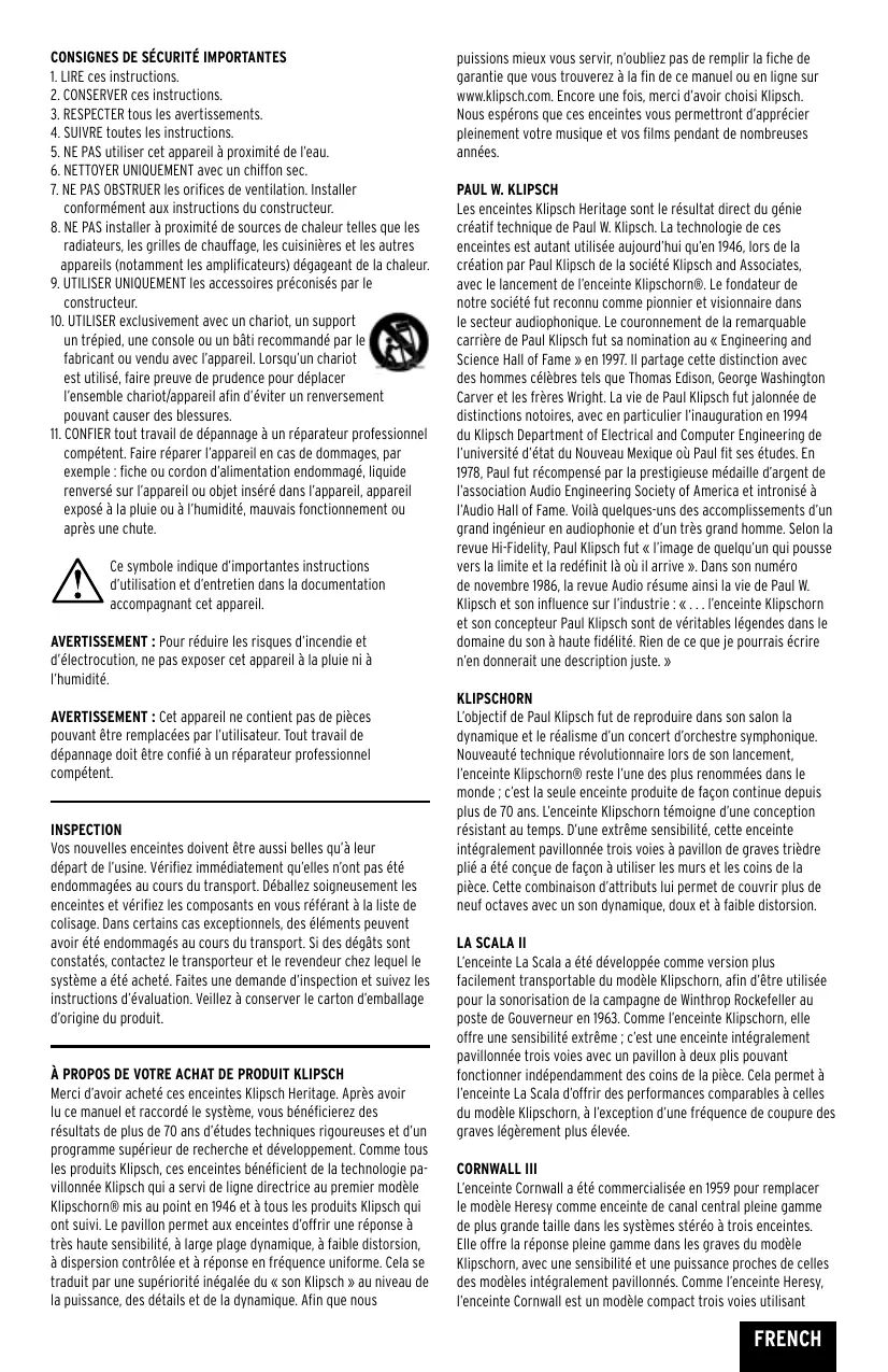 Merci d'avoir acheté ces enceintes Klipsch Heritage. Avec avoir lu ce manuel et raccordé le système, vous bénéficierez des résultats de plus de 70 ans d'études techniques rigoureuses et d'un programme supérieur de recherche et développement. comme tous les produits Klipsch, ces enceintes bénéficient de la technologie pavillonnée Klipsch qui a servi de ligne directrice au premier modele Klipschorn@ mis au point en 1946 et a tous les produits Klipsch qui ont suivi. Le pavillon permet aux enceintes d'offrir une response à très haute sensibilité, à large plage dynamique, à faible distorsion, à dispersion contrôlée et à réponse en fréquence uniforme. Cela se traduit par une supérieorerie inégalée du « son Klipsch » au niveau de la puissance, des détails et de la dynamique. Afin que nous