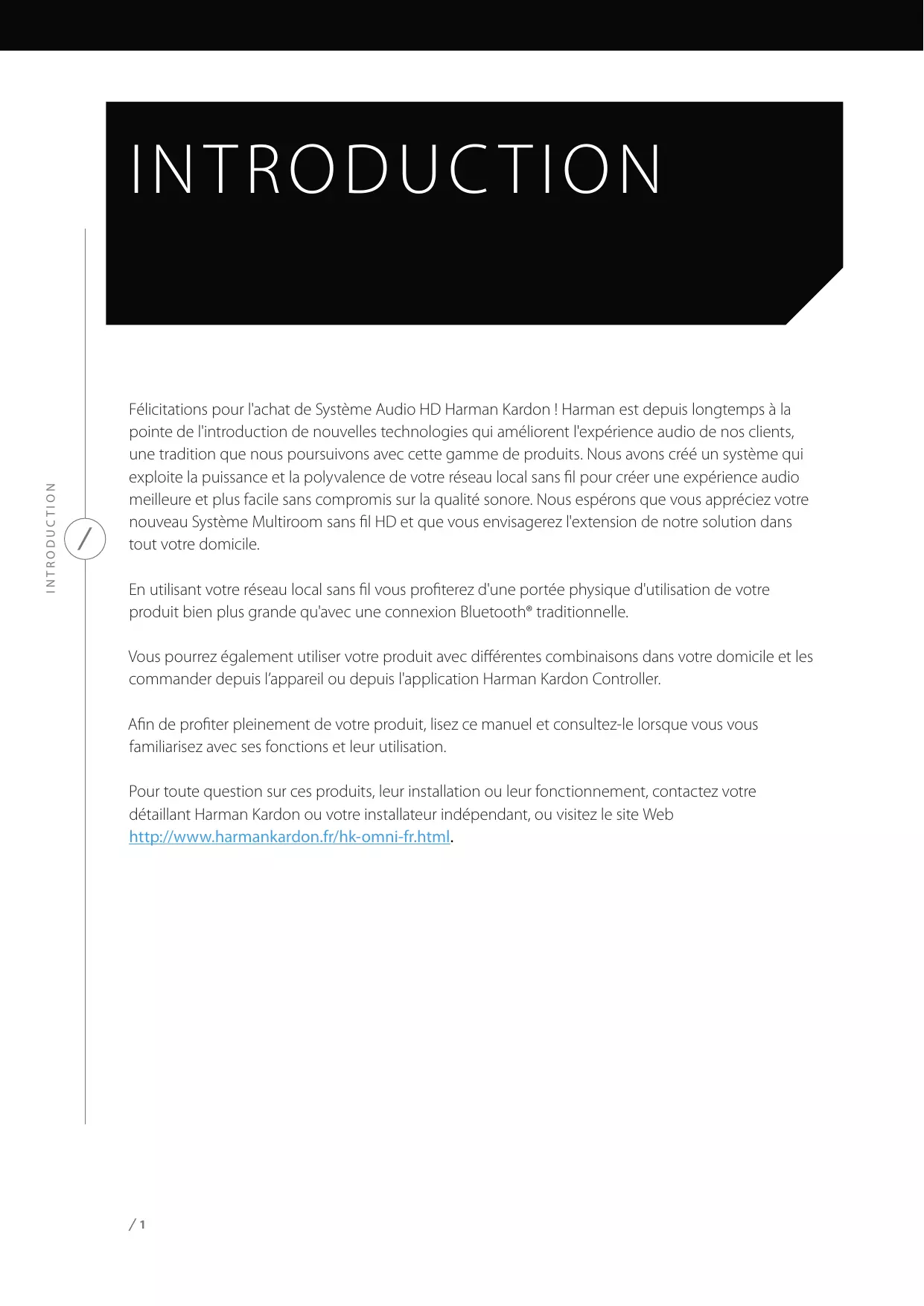 MODE D'EMPLOI INTRODUCTION IN T R O DUC T I O N Félicitations pour l'achat de Système Audio HD Harman Kardon ! Harman est depuis longtemps à la pointe de l'introduction de nouvelles technologies qui améliorent l'expérience audio de nos clients, une tradition que nous poursuivons avec cette gamme de produits. Nous avons créé un système qui exploite la puissance et la polyvalence de votre réseau local sans fil pour créer une expérience audio meilleure et plus facile sans compromis sur la qualité sonore. Nous espérons que vous appréciez votre nouveau Système Multiroom sans fil HD et que vous envisagerez l'extension de notre solution dans tout votre domicile. En utilisant votre réseau local sans fil vous profiterez d'une portée physique d'utilisation de votre produit bien plus grande qu'avec une connexion Bluetooth® traditionnelle. Vous pourrez également utiliser votre produit avec différentes combinaisons dans votre domicile et les commander depuis l’appareil ou depuis l'application Harman Kardon Controller. Afin de profiter pleinement de votre produit, lisez ce manuel et consultez-le lorsque vous vous familiarisez avec ses fonctions et leur utilisation. Pour toute question sur ces produits, leur installation ou leur fonctionnement, contactez votre détaillant Harman Kardon ou votre installateur indépendant, ou visitez le site Web http://www.harmankardon.fr/hk-omni-fr.html.