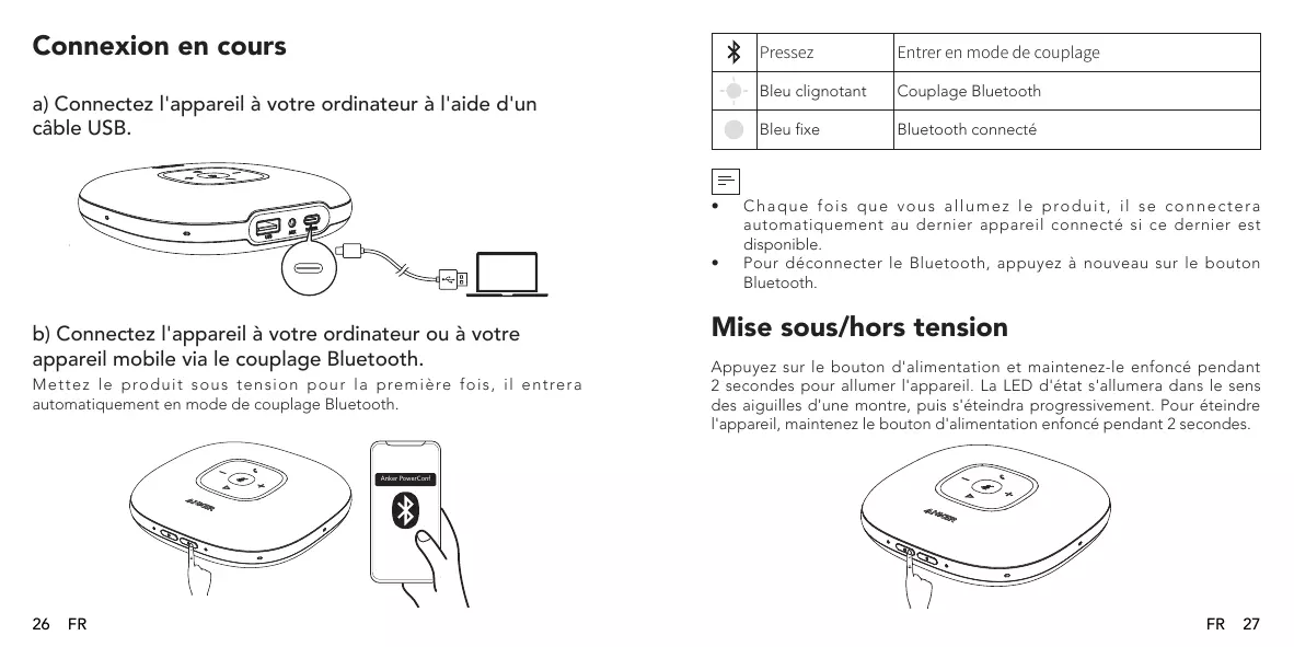 b) Connectez l'appareil à votre ordinateur ou à votre appareil mobile via le couplage Bluetooth. Mettez le produit sous tension pour la première fois, il entrera automatiquement en mode de couplage Bluetooth. C h a q u e f o i s q u e v o u s a l l u m e z l e p ro d u i t , i l s e c o n n e c t e r a automatiquement au dernier appareil connecté si ce dernier est disponible. Pour déconnecter le Bluetooth, appuyez à nouveau sur le bouton Bluetooth. Mise sous/hors tension Appuyez sur le bouton d'alimentation et maintenez-le enfoncé pendant 2 secondes pour allumer l'appareil. La LED d'état s'allumera dans le sens des aiguilles d'une montre, puis s'éteindra progressivement. Pour éteindre l'appareil, maintenez le bouton d'alimentation enfoncé pendant 2 secondes. Anker PowerConf
