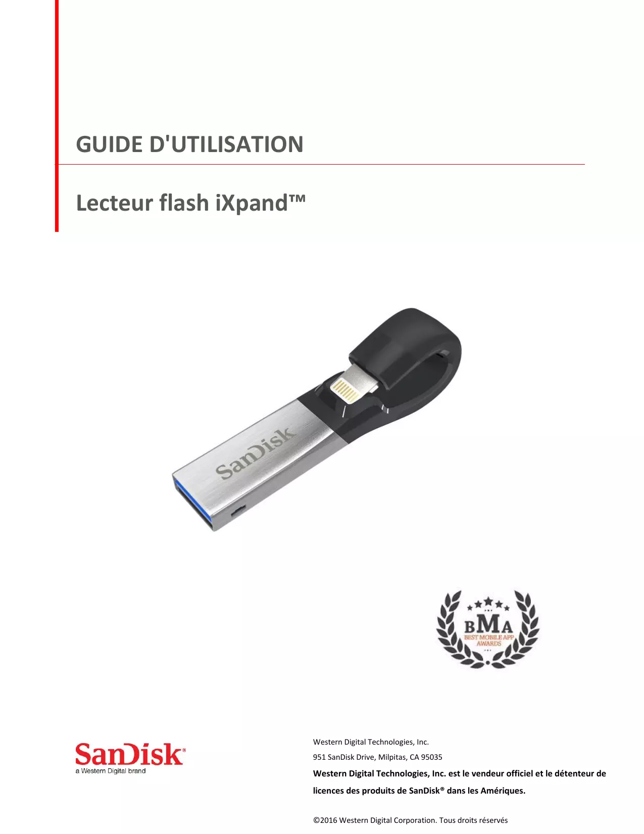GUIDE D'UTILISATION Lecteur flash iXpand™ Western Digital Technologies, Inc. 951 SanDisk Drive, Milpitas, CA 95035 Western Digital Technologies, Inc. est le vendeur officiel et le détenteur de licences des produits de SanDisk® dans les Amériques. ©2016 Western Digital Corporation. Tous droits réservés Introduction Mise en route