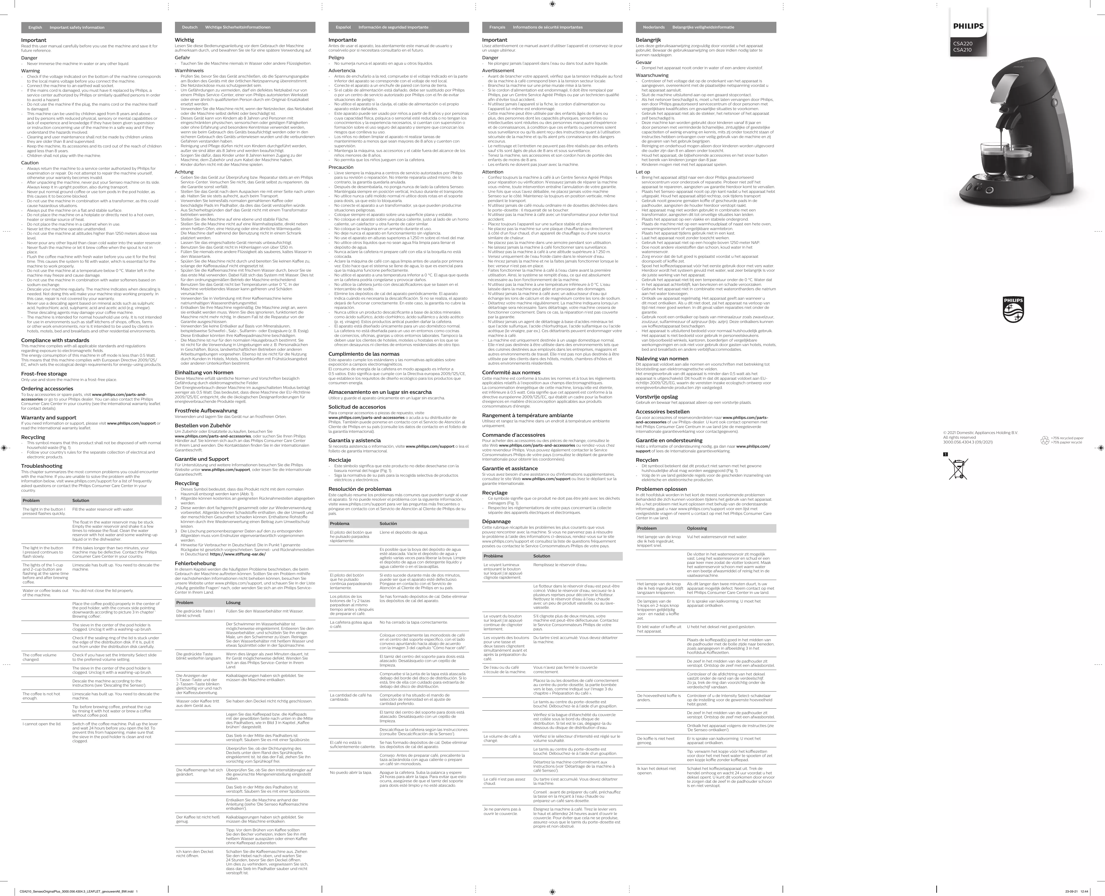 Confiez toujours la machine à café à un Centre Service Agréé Philips pour réparation ou vérification. N’essayez jamais de réparer la machine vous-même, toute intervention entraîne l’annulation de votre garantie. Une fois que vous l’avez déballée, ne placez jamais votre machine Senseo sur le côté. Maintenez-la toujours en position verticale, même pendant le transport. N’utilisez jamais de café moulu ordinaire ni de dosettes déchirées dans le porte-dosette : il risquerait de se boucher. N‘utilisez pas la machine à café avec un transformateur pour éviter tout accident. Placez toujours l‘appareil sur une surface stable et plane. Ne placez pas la machine sur une plaque chauffante ou directement à côté d‘un four chaud, d‘un appareil de chauffage ou d‘une source similaire de chaleur. Ne placez pas la machine dans une armoire pendant son utilisation. Ne laissez jamais la machine à café fonctionner sans surveillance. N’utilisez pas la machine à café à une altitude supérieure à 1 250 m. Versez uniquement de l’eau froide claire dans le réservoir d’eau. Ne rincez jamais la machine et ne la faites jamais fonctionner lorsque le bec verseur n’est pas en place. Faites fonctionner la machine à café à l’eau claire avant la première utilisation. Ainsi, le système se remplit d’eau, ce qui est absolument nécessaire au bon fonctionnement de la machine. N‘utilisez pas la machine à une température inférieure à 0 °C. L’eau laissée dans la machine peut geler et provoquer des dommages. N‘utilisez jamais la machine à café avec un adoucisseur d‘eau qui échange les ions de calcium et de magnésium contre les ions de sodium. Détartrez votre machine régulièrement. La machine indiquera lorsqu‘un détartrage sera nécessaire. Sans détartrage, votre machine cessera de fonctionner correctement. Dans ce cas, la réparation n‘est pas couverte par la garantie. N‘utilisez jamais un agent de détartrage à base d‘acides minéraux tel que l‘acide sulfurique, l‘acide chlorhydrique, l‘acide sulfamique ou l‘acide acétique (le vinaigre, par ex.). Ces détartrants peuvent endommager votre machine à café. La machine est uniquement destinée à un usage domestique normal. Elle n‘est pas destinée à être utilisée dans des environnements tels que des cuisines destinées aux employés dans les entreprises, magasins et autres environnements de travail. Elle n‘est pas non plus destinée à être utilisée par des clients dans des hôtels, motels, chambres d‘hôtes et autres environnements résidentiels.