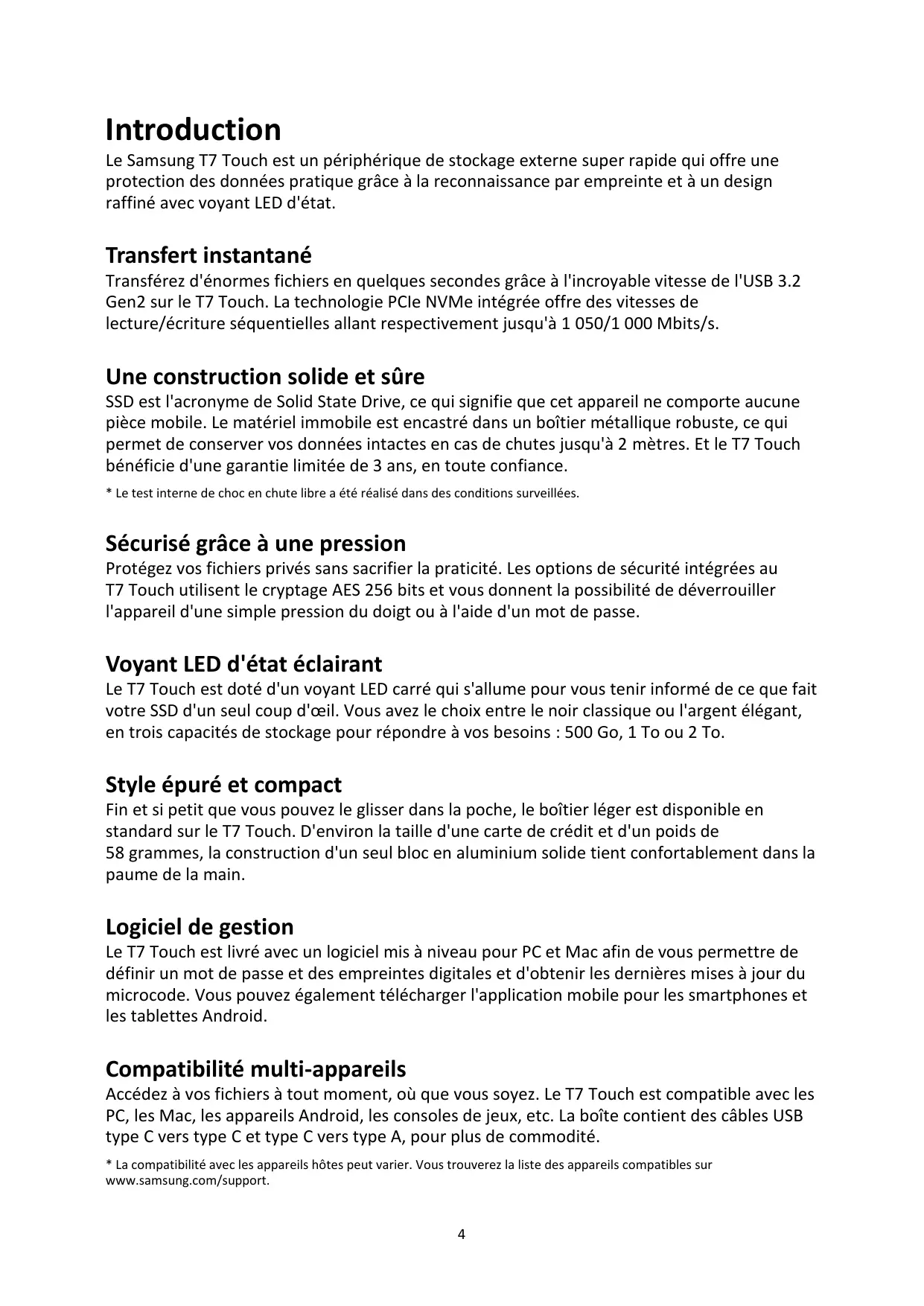 Avant d'utiliser le Samsung Portable SSD T7 Touch (appele « T7 Touch »), veuilles lire attentivement leprésent Manuel d'utilisation afin de vous familiariser avec l'emploi sur et approprié du produit.