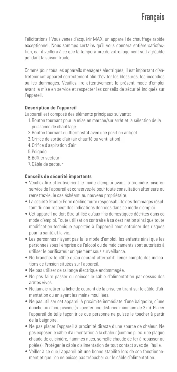 MAX BLANC - Chauffage d'appoint STADLERFORM - Notice d'utilisation et mode d'emploi gratuit