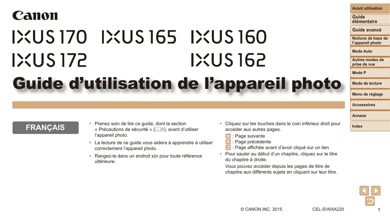 Écran (Écran LCD) Indicateur Borne AV OUT (Sortie audio/ Touche Vidéo vidéo) / DIGITAL Touche FUNC./SET Touche <1 (Lecture)> Touche <h (Flash)> / Droite Touche <A (Auto)> / Touche <l (Affichage)> / Bas <a (Effacer une image)> / Haut Touche <n> Touche < > / Gauche Orifice pour le câble de Touche < (Aide)> l’adaptateur secteur Dans ce guide, les icônes sont utilisées pour représenter les touches correspondantes de l’appareil photo sur lesquelles elles apparaissent ou auxquelles elles ressemblent. Les touches et les commandes suivantes de l’appareil photo sont représentées par des icônes. <o> Touche Haut au dos <r> Touche Droite au dos <q> Touche Gauche au dos <p> Touche Bas au dos Les icônes suivantes sont utilisées pour indiquer les fonctions qui diffèrent selon le modèle d’appareil photo : IXUS 170 : Fonctions et précautions relatives au IXUS 170 et IXUS 172 IXUS 165 : Fonctions et précautions relatives au IXUS 165 uniquement IXUS 160 : Fonctions et précautions relatives au IXUS 160 et IXUS 162 Ce guide utilise les illustrations et les captures d’écran du IXUS 170 à titre explicatif. Mode P Mode de lecture Menu de réglage Accessoires Annexe Index